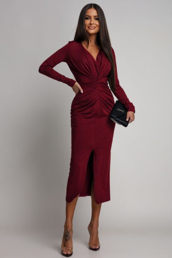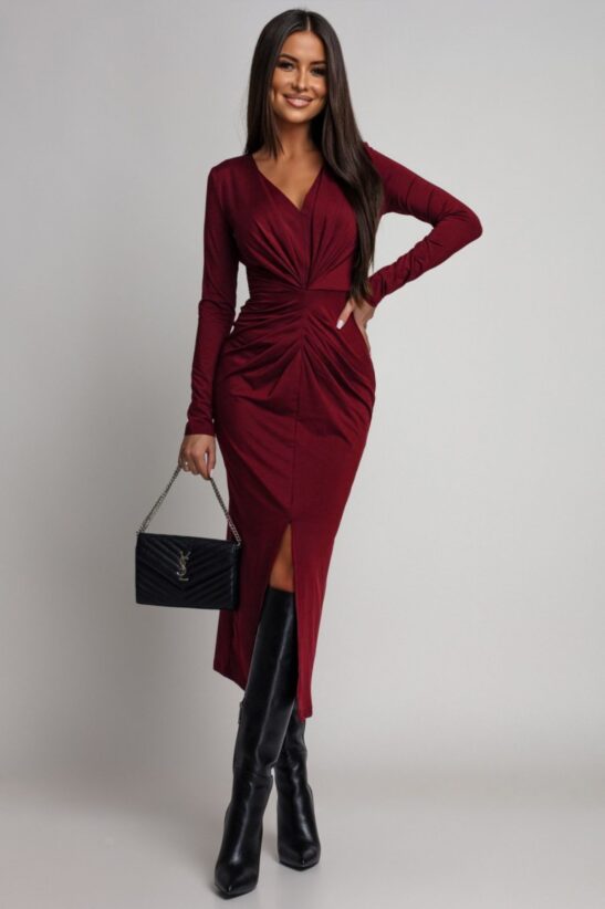 Αναδείξτε το στυλ σας με το απόλυτο ελαστικό midi φόρεμα. Το φόρεμα διαθέτει κολακευτικό V-ντεκολτέ και μακριά μανίκια, προσφέροντας μια σικ και διακριτική εμφάνιση. Το χαρακτηριστικό του γνώρισμα είναι η εντυπωσιακή λεπτομέρεια με σούρες στο μπούστο και τη μέση, που αγκαλιάζει το σώμα και τονίζει τις καμπύλες. Η ελαστική εφαρμογή εξασφαλίζει άνεση και τέλεια εφαρμογή σε κάθε σωματότυπο, ενώ το διακριτικό σχίσιμο στο πόδι προσθέτει έναν αέρα θηλυκότητας και κίνησης. Συνδυάστε το με ψηλές μπότες ή γόβες και την αγαπημένη σας τσάντα για ένα look που μαγνητίζει!
