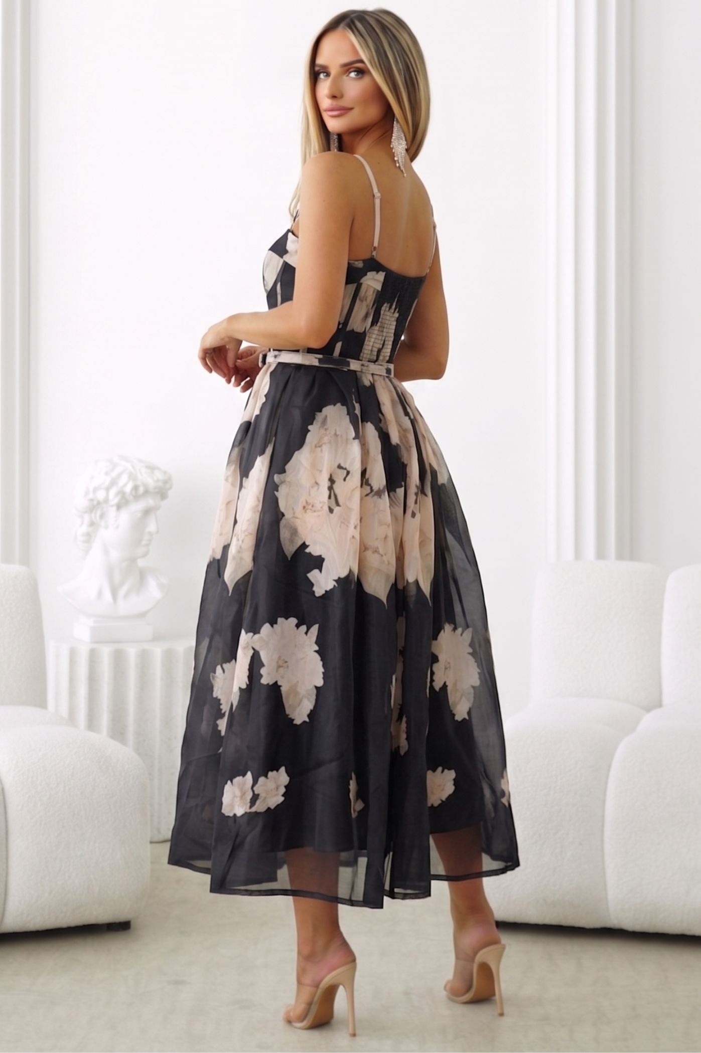 ΦΟΡΕΜΑ MIDI FLORAL CORSET ΜΕ ΤΙΡΑΝΤΕΣ – ΜΑΥΡΟ
