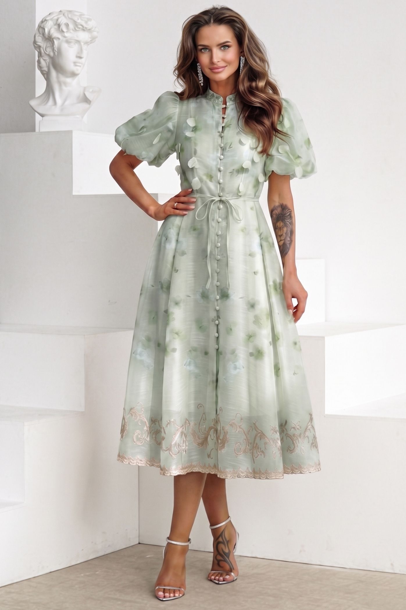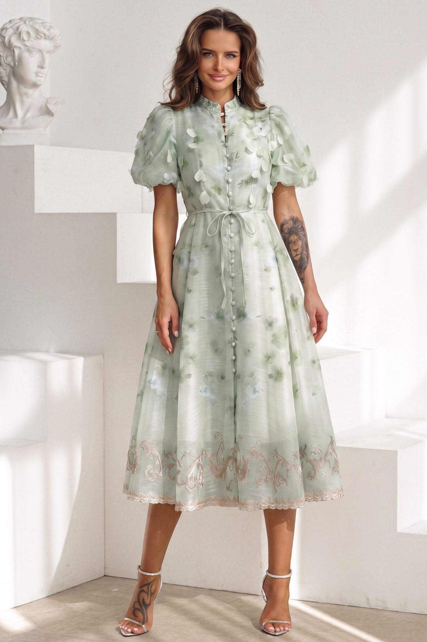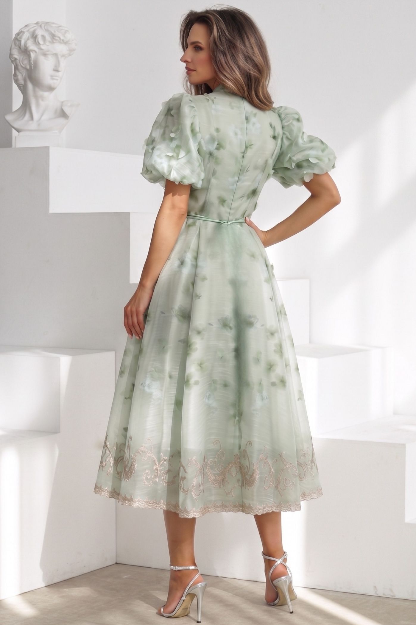 Αναδείξτε τη θηλυκότητά σας με αυτό το εντυπωσιακό midi floral φόρεμα. Ένα κομμάτι που αποπνέει ρομαντισμό και vintage αισθητική, ιδανικό για τις πιο ιδιαίτερες στιγμές σας, από γάμους και βαφτίσεις μέχρι επίσημα καλοκαιρινά events. Τα φουσκωτά μανίκια προσθέτουν μια αέρινη και μοντέρνα πινελιά που χαρίζει στυλ και κίνηση. Το ντελικάτο floral μοτίβο σε παστέλ τόνους δημιουργεί ένα ονειρικό αποτέλεσμα που κλέβει τις εντυπώσεις. Το φόρεμα διαθέτει κομψή σειρά από κουμπιά στο μπροστινό μέρος και μια εντυπωσιακή κεντημένη μπορντούρα στο τελείωμα, που αναβαθμίζει τη συνολική του εμφάνιση. Διαθέτει ζώνη στη μέση που κολακεύει τη σιλουέτα, προσφέροντας απόλυτη ισορροπία ανάμεσα στην άνεση και τη θηλυκότητα.
