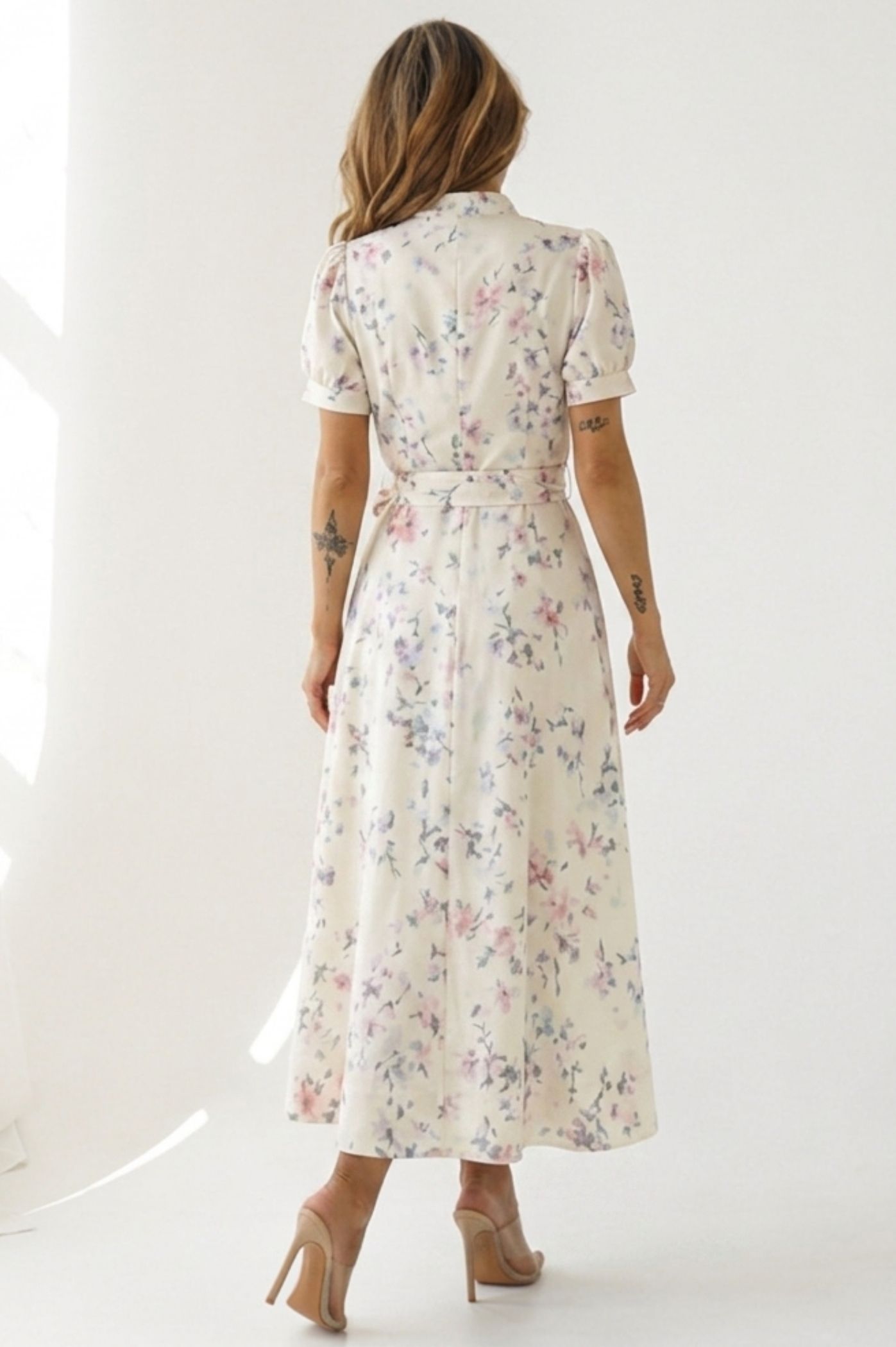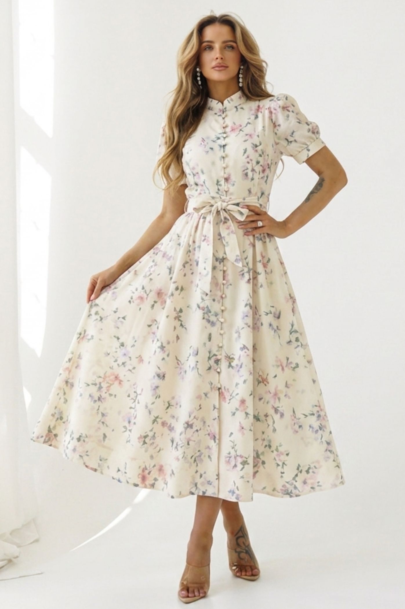 Αναδείξτε τη φινέτσα και τη θηλυκότητα σε ένα μόνο κομμάτι. Αυτό το midi φόρεμα σε παστέλ floral αποχρώσεις είναι η ιδανική επιλογή για κάθε γυναίκα που αναζητά ένα chic και αέρινο look για την άνοιξη ή το καλοκαίρι. Το ντελικάτο μοτίβο με λουλούδια δημιουργεί ένα ρομαντικό και φρέσκο αποτέλεσμα. Διαθέτει διακριτικά κουμπιά στο μπροστινό μέρος, προσδίδοντας μια διαχρονική vintage αισθητική. Η ενσωματωμένη ζώνη που δένει στη μέση αγκαλιάζει τη σιλουέτα σας, προσφέροντας κολακευτική εφαρμογή και θηλυκή γραμμή. Τα φουσκωτά μανίκια (puff sleeves) προσθέτουν μια μοντέρνα πινελιά και κάνουν το φόρεμα ιδιαίτερα άνετο και κομψό για κάθε ώρα της ημέρας.