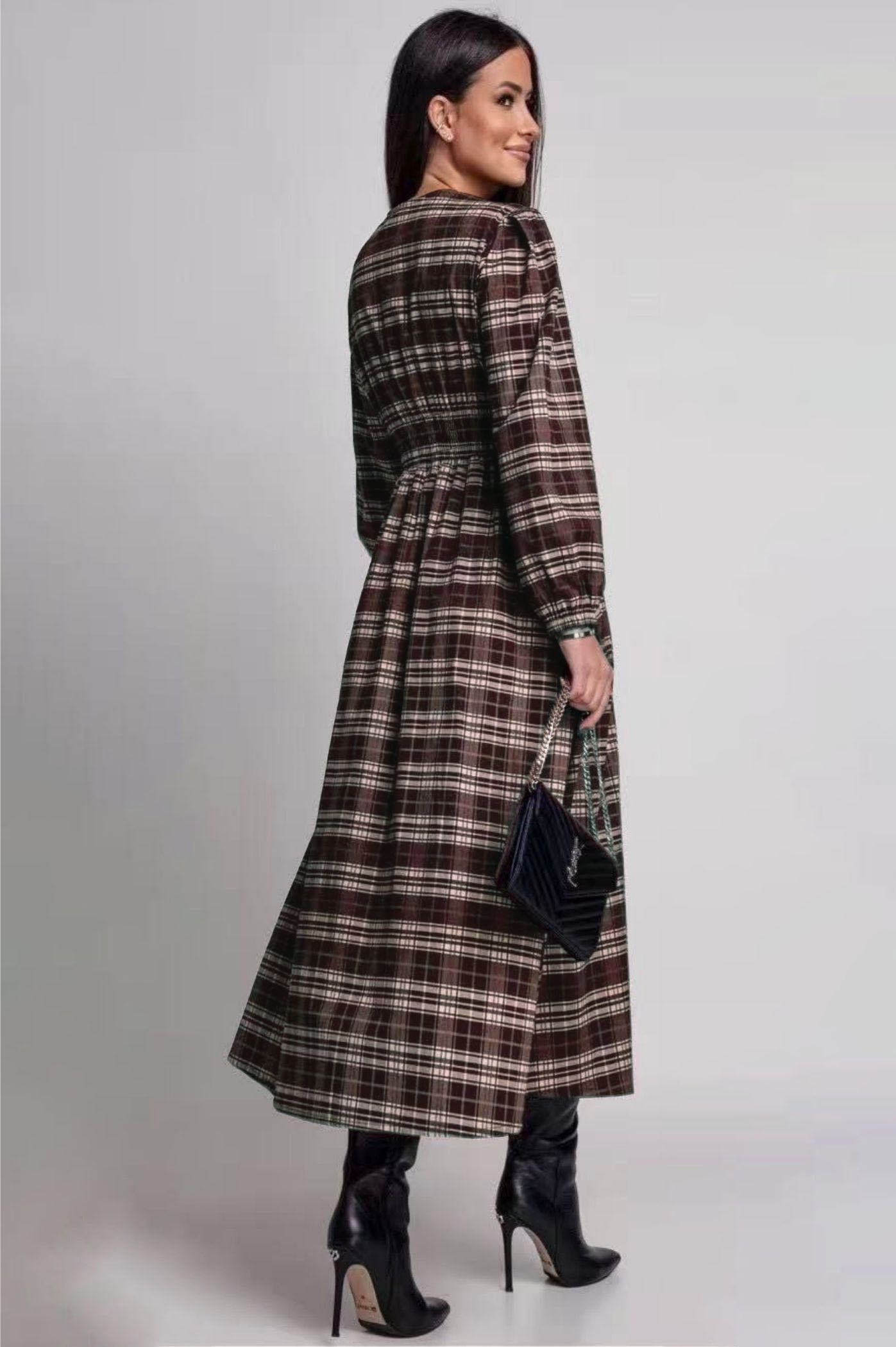 Επιλέξτε την κομψότητα και την άνεση με αυτό το midi φόρεμα σε καρό μοτίβο, ιδανικό για ένα layering look. Το φόρεμα είναι τύπου σεμιζιέ (πουκαμισοφόρεμα), με κουμπιά σε όλο το μήκος και μακρύ μανίκι, προσφέροντας πολλαπλές επιλογές στο στυλ. Η μέση αγκαλιάζει και τονίζει τη σιλουέτα, ενώ το μήκος midi το καθιστά ιδανικό για να συνδυαστεί με αρβυλάκια ή μπότες. Το διαχρονικό καρό είναι το απόλυτο trend για τις φθινοπωρινές και χειμερινές εμφανίσεις, χαρίζοντας ένα στιλάτο και δυναμικό ύφος.