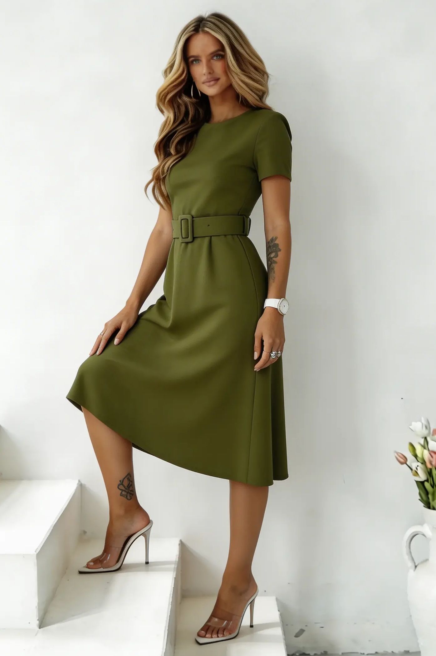 Αναδείξτε τη θηλυκότητά σας με αυτό το εντυπωσιακό μίντι φόρεμα, σχεδιασμένο για τη σύγχρονη γυναίκα που αναζητά στυλ και άνεση σε κάθε της εμφάνιση. Με minimal αισθητική και άψογη εφαρμογή, αποτελεί την ιδανική επιλογή για το γραφείο, τις απογευματινές βόλτες ή μια επίσημη κοινωνική εκδήλωση. Μίντι μήκος που προσφέρει σοφιστικέ αέρα. Διαθέτει φαρδιά ζώνη με αγκράφα που σμιλεύει τη σιλουέτα και τονίζει τη μέση. Κοντό μανίκι με ελαφριά ενίσχυση στους ώμους για δομημένο look. Υψηλής ποιότητας υλικό που αγκαλιάζει το σώμα χωρίς να περιορίζει την κίνηση.