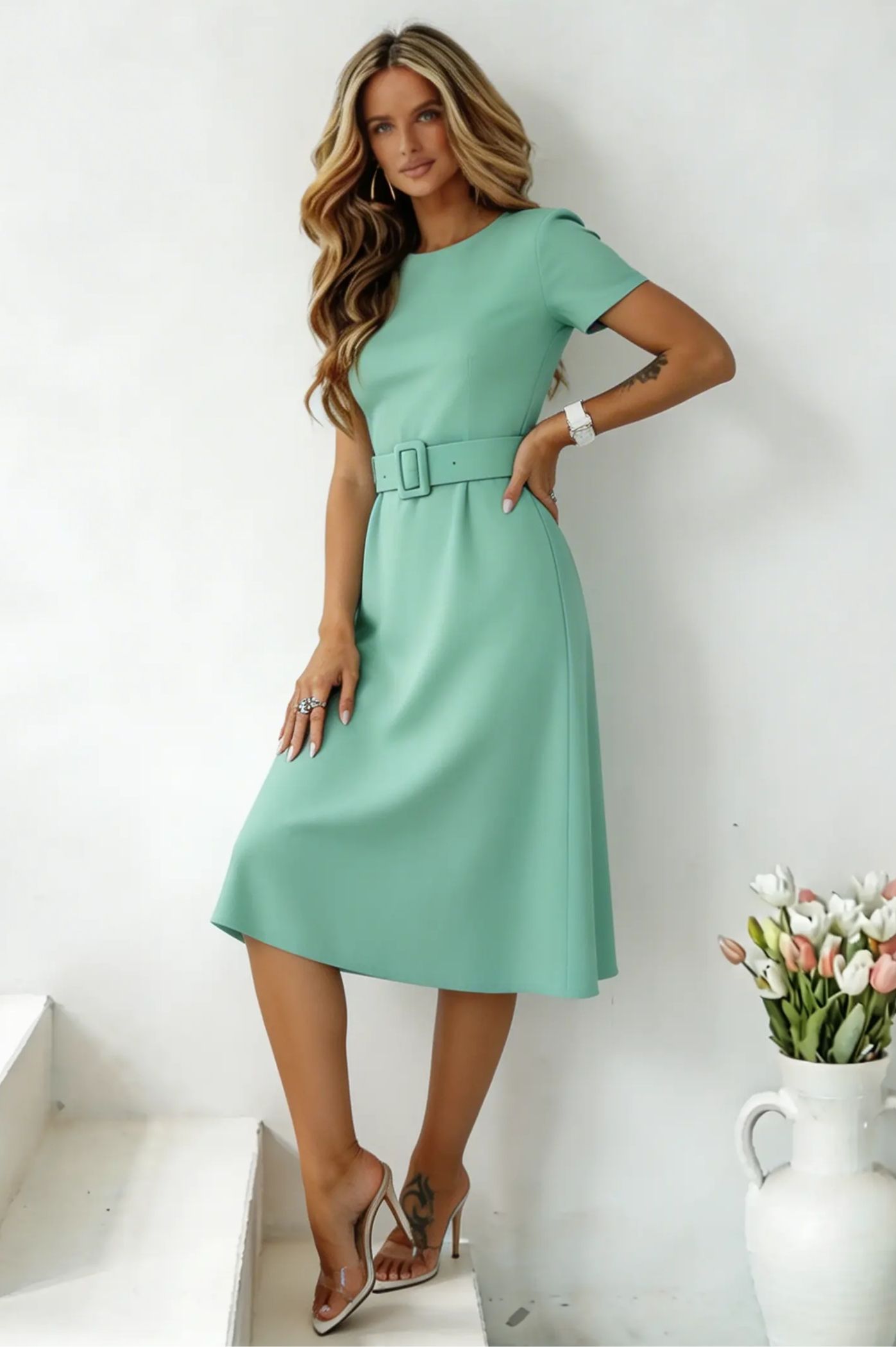 Αναδείξτε τη θηλυκότητά σας με αυτό το εντυπωσιακό μίντι φόρεμα, σχεδιασμένο για τη σύγχρονη γυναίκα που αναζητά στυλ και άνεση σε κάθε της εμφάνιση. Με minimal αισθητική και άψογη εφαρμογή, αποτελεί την ιδανική επιλογή για το γραφείο, τις απογευματινές βόλτες ή μια επίσημη κοινωνική εκδήλωση. Μίντι μήκος που προσφέρει σοφιστικέ αέρα. Διαθέτει φαρδιά ζώνη με αγκράφα που σμιλεύει τη σιλουέτα και τονίζει τη μέση. Κοντό μανίκι με ελαφριά ενίσχυση στους ώμους για δομημένο look. Υψηλής ποιότητας υλικό που αγκαλιάζει το σώμα χωρίς να περιορίζει την κίνηση.