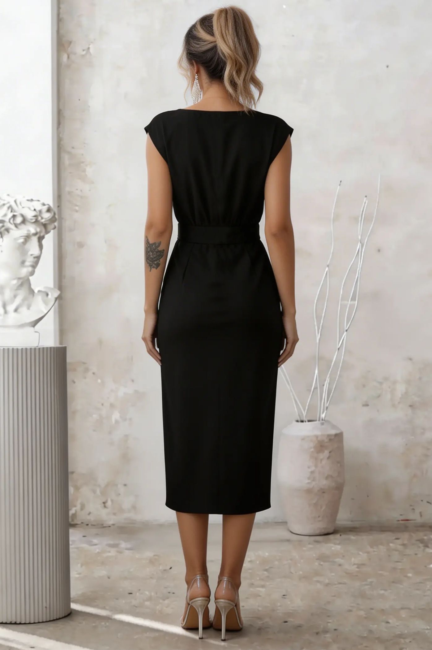 Αναδείξτε τη σιλουέτα σας με αυτό το statement midi φόρεμα, σχεδιασμένο για να προσφέρει διαχρονικό στυλ και αυτοπεποίθηση. Με ιδιαίτερη προσοχή στη λεπτομέρεια, το φόρεμα συνδυάζει την κλασική γραμμή με μοντέρνες πινελιές, καθιστώντας το την τέλεια επιλογή για γάμους, βαπτίσεις ή cocktail parties. Midi μήκος που κολακεύει κάθε σωματότυπο, με αμάνικο κόψιμο και κομψή κλειστή λαιμόκοψη. Διαθέτει εντυπωσιακό κρουαζέ σχέδιο στη μέση που δημιουργεί ντραπέ λεπτομέρειες, κρύβοντας ατέλειες και τονίζοντας τη μέση. Η χρυσή διακοσμητική αγκράφα στο πλάι προσθέτει μια δόση πολυτέλειας και λάμψης στο σύνολο.