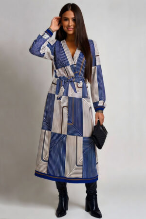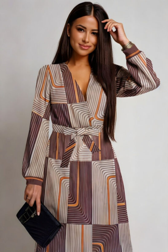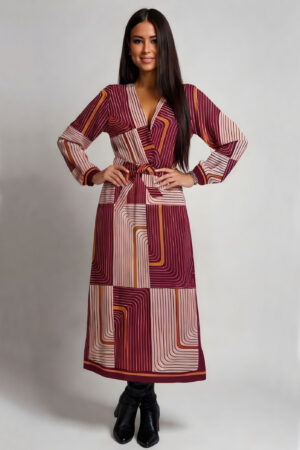 Αναδείξτε το στυλ σας με αυτό το Midi φόρεμα σε γεωμετρικό print. Το κύριο χαρακτηριστικό του είναι το έντονο γεωμετρικό print, δίνοντας μια ρετρό αίσθηση. Το φόρεμα είναι μακρυμάνικο και δένει στη μέση με ζώνη από το ίδιο ύφασμα, τονίζοντας τη σιλουέτα. Το μήκος του φτάνει περίπου στη γάμπα. Είναι ένα κομψό και ιδιαίτερο φόρεμα, κατάλληλο για εμφανίσεις από το πρωί έως το βράδυ.
