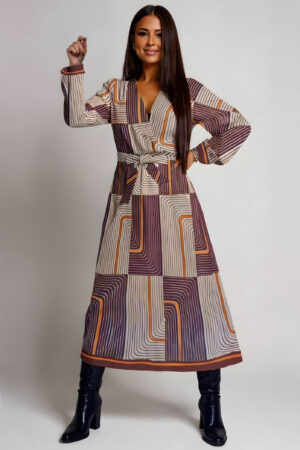 Αναδείξτε το στυλ σας με αυτό το Midi φόρεμα σε γεωμετρικό print. Το κύριο χαρακτηριστικό του είναι το έντονο γεωμετρικό print, δίνοντας μια ρετρό αίσθηση. Το φόρεμα είναι μακρυμάνικο και δένει στη μέση με ζώνη από το ίδιο ύφασμα, τονίζοντας τη σιλουέτα. Το μήκος του φτάνει περίπου στη γάμπα. Είναι ένα κομψό και ιδιαίτερο φόρεμα, κατάλληλο για εμφανίσεις από το πρωί έως το βράδυ.