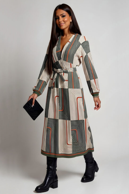 Αναδείξτε το στυλ σας με αυτό το Midi φόρεμα σε γεωμετρικό print. Το κύριο χαρακτηριστικό του είναι το έντονο γεωμετρικό print, δίνοντας μια ρετρό αίσθηση. Το φόρεμα είναι μακρυμάνικο και δένει στη μέση με ζώνη από το ίδιο ύφασμα, τονίζοντας τη σιλουέτα. Το μήκος του φτάνει περίπου στη γάμπα. Είναι ένα κομψό και ιδιαίτερο φόρεμα, κατάλληλο για εμφανίσεις από το πρωί έως το βράδυ.