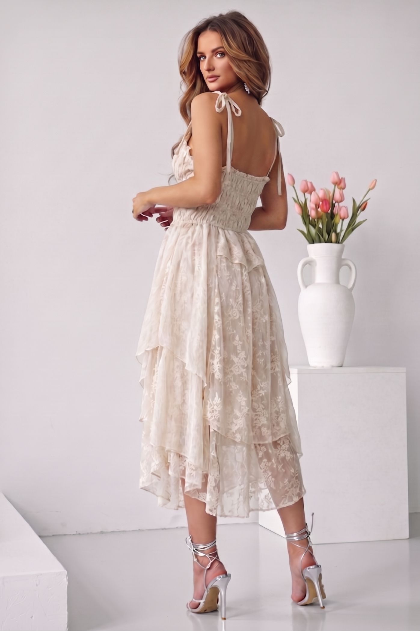 Αναδείξτε την γκαρνταρόμπα σας με αυτό το εκλεπτυσμένο midi φόρεμα σε μπεζ απόχρωση, ιδανικό για επίσημες εμφανίσεις, γάμους ή κοκτέιλ πάρτι. Ο ρομαντικός του σχεδιασμός συνδυάζει την κομψότητα με τη θηλυκότητα, καθιστώντας το ένα must-have κομμάτι για κάθε σύγχρονη γυναίκα. Midi μήκος με εντυπωσιακά βολάν που προσθέτουν κίνηση και χάρη σε κάθε σας βήμα. Διακοσμημένο με περίτεχνες λεπτομέρειες τύπου guipure (kipour) και δαντέλα, που προσδίδουν μια vintage αισθητική και αίσθηση πολυτέλειας. Διαθέτει λεπτές τιράντες που δένουν, προσφέροντας απόλυτη εφαρμογή και άνεση. Το μπούστο είναι σχεδιασμένο με σφηκοφωλιά (smocked) στη μέση, τονίζοντας τη σιλουέτα με τον πιο κολακευτικό τρόπο.
