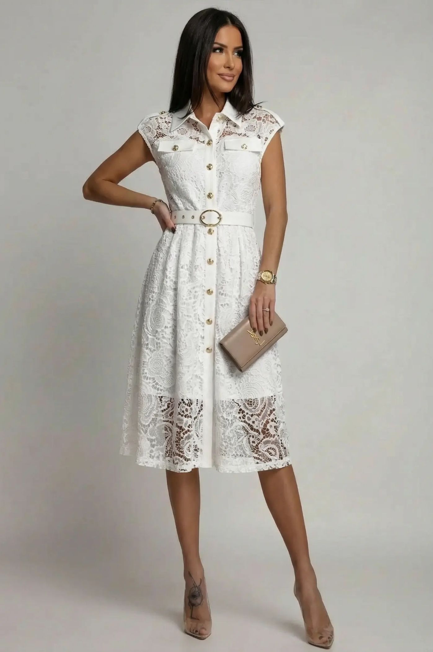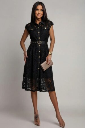 Αναδείξτε την απόλυτη ισορροπία μεταξύ κλασικής κομψότητας και σύγχρονου στυλ με αυτό το midi φόρεμα από δαντέλα. Αποτελεί την ιδανική επιλογή για γυναίκες που αναζητούν ένα προσεγμένο look για επίσημες εκδηλώσεις, επαγγελματικά ραντεβού ή κοινωνικές υποχρεώσεις. Επενδυμένο με ντελικάτη δαντέλα υψηλής ποιότητας σε όλη την επιφάνεια, που προσφέρει μια αίσθηση πολυτέλειας. Διαθέτει κλασικό γιακά και τσέπες στο στήθος με διακοσμητικά κουμπιά, συνδυάζοντας το θηλυκό στοιχείο με το δυναμικό στυλ. Διαθέτει ζώνη με στρόγγυλη αγκράφα στο ίδιο χρώμα, η οποία σμιλεύει τη σιλουέτα και αναδεικνύει τη θηλυκότητά σας. Η σειρά από χρυσά κουμπιά στο μπροστινό μέρος προσθέτει μια extra λάμψη και ευκολία στην εφαρμογή. Η γραμμή που φτάνει κάτω από το γόνατο προσφέρει κομψότητα και είναι κατάλληλη για κάθε ηλικία και σωματότυπο.