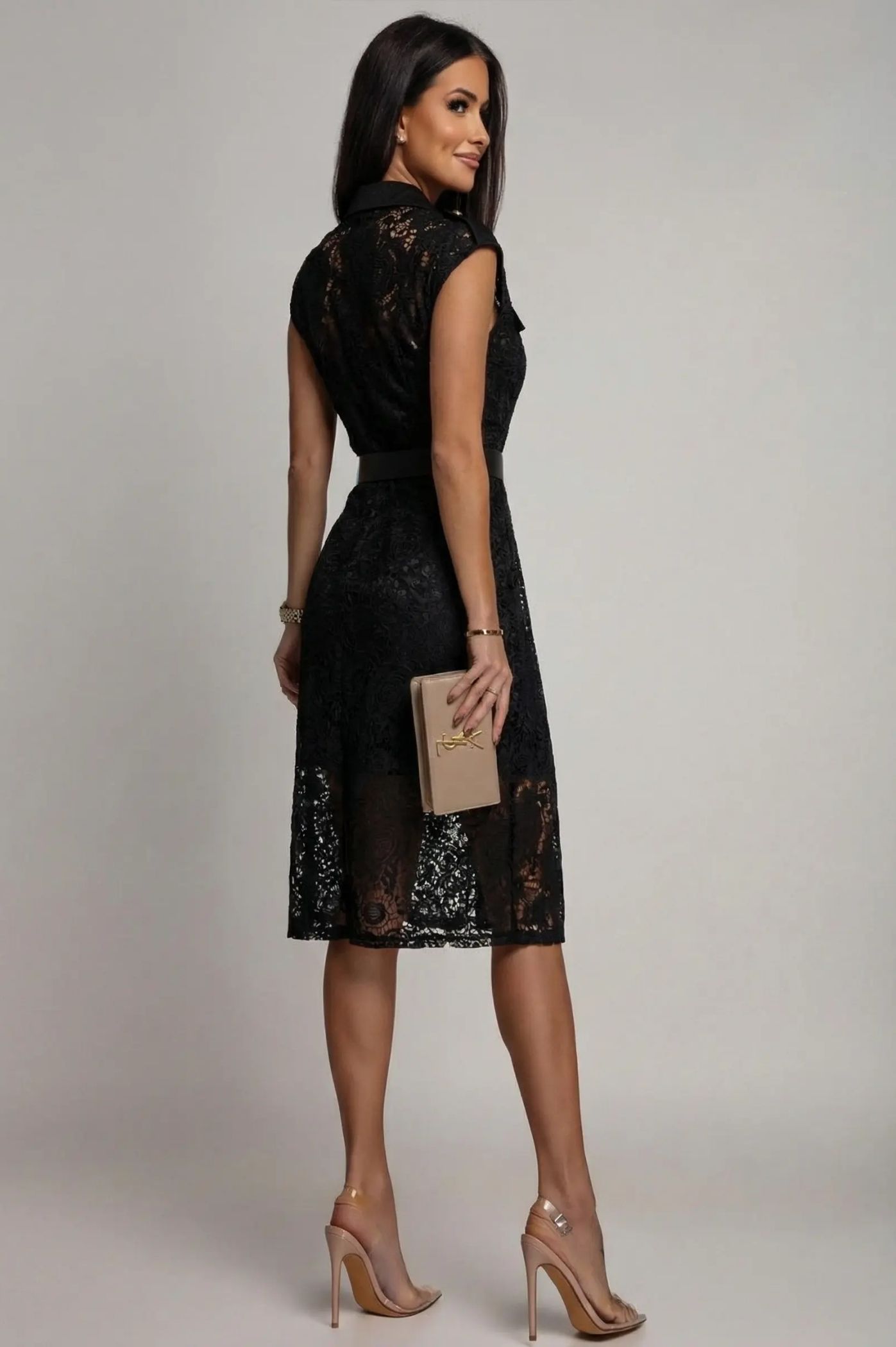 Αναδείξτε την απόλυτη ισορροπία μεταξύ κλασικής κομψότητας και σύγχρονου στυλ με αυτό το midi φόρεμα από δαντέλα. Αποτελεί την ιδανική επιλογή για γυναίκες που αναζητούν ένα προσεγμένο look για επίσημες εκδηλώσεις, επαγγελματικά ραντεβού ή κοινωνικές υποχρεώσεις. Επενδυμένο με ντελικάτη δαντέλα υψηλής ποιότητας σε όλη την επιφάνεια, που προσφέρει μια αίσθηση πολυτέλειας. Διαθέτει κλασικό γιακά και τσέπες στο στήθος με διακοσμητικά κουμπιά, συνδυάζοντας το θηλυκό στοιχείο με το δυναμικό στυλ. Διαθέτει ζώνη με στρόγγυλη αγκράφα στο ίδιο χρώμα, η οποία σμιλεύει τη σιλουέτα και αναδεικνύει τη θηλυκότητά σας. Η σειρά από χρυσά κουμπιά στο μπροστινό μέρος προσθέτει μια extra λάμψη και ευκολία στην εφαρμογή. Η γραμμή που φτάνει κάτω από το γόνατο προσφέρει κομψότητα και είναι κατάλληλη για κάθε ηλικία και σωματότυπο.