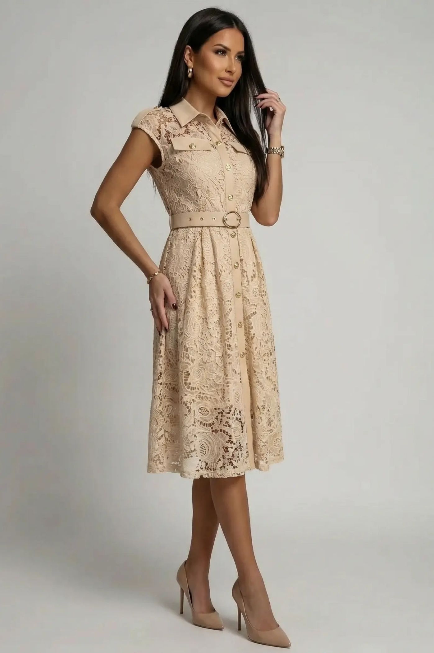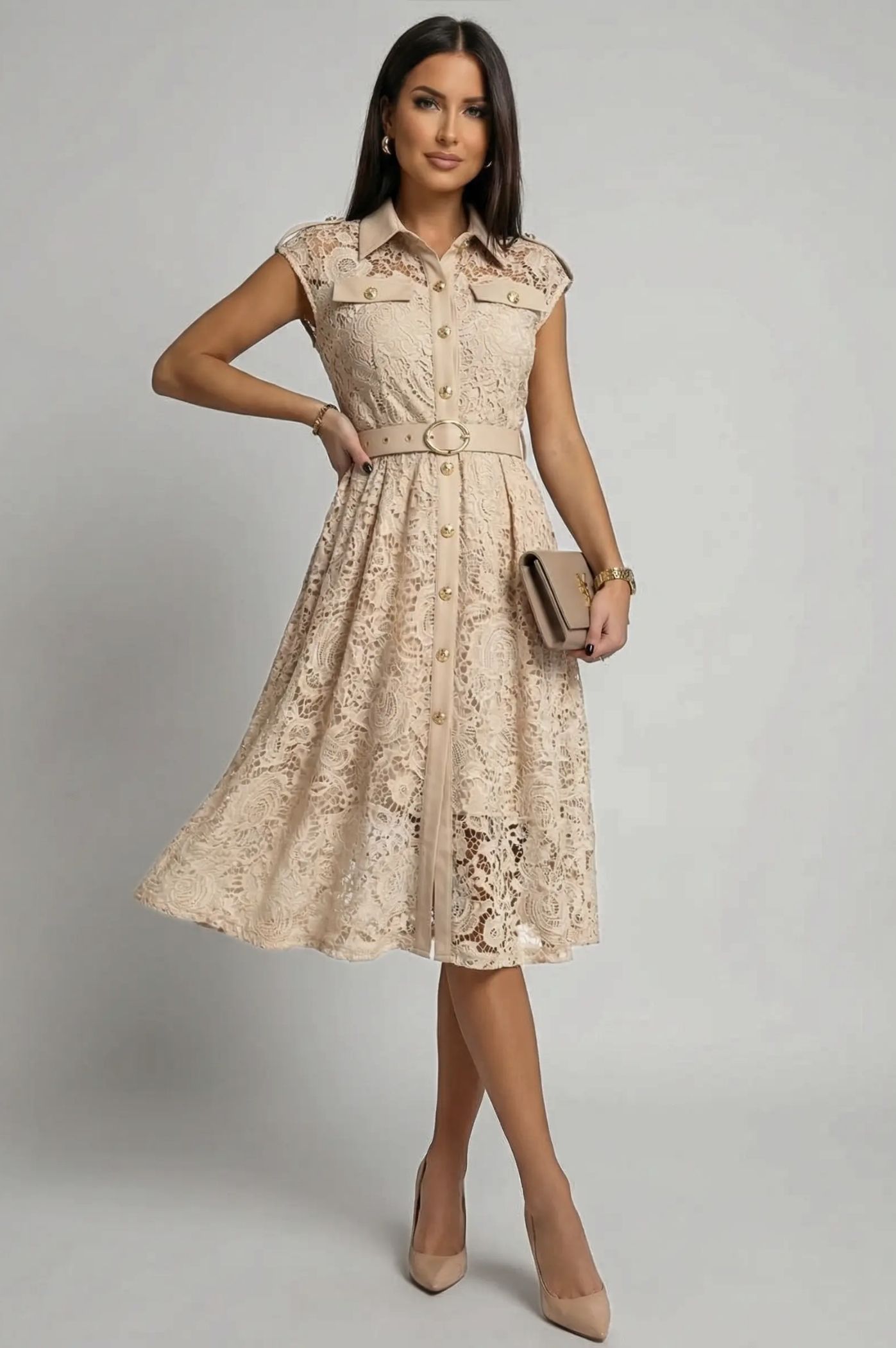 Αναδείξτε την απόλυτη ισορροπία μεταξύ κλασικής κομψότητας και σύγχρονου στυλ με αυτό το midi φόρεμα από δαντέλα. Αποτελεί την ιδανική επιλογή για γυναίκες που αναζητούν ένα προσεγμένο look για επίσημες εκδηλώσεις, επαγγελματικά ραντεβού ή κοινωνικές υποχρεώσεις. Επενδυμένο με ντελικάτη δαντέλα υψηλής ποιότητας σε όλη την επιφάνεια, που προσφέρει μια αίσθηση πολυτέλειας. Διαθέτει κλασικό γιακά και τσέπες στο στήθος με διακοσμητικά κουμπιά, συνδυάζοντας το θηλυκό στοιχείο με το δυναμικό στυλ. Διαθέτει ζώνη με στρόγγυλη αγκράφα στο ίδιο χρώμα, η οποία σμιλεύει τη σιλουέτα και αναδεικνύει τη θηλυκότητά σας. Η σειρά από χρυσά κουμπιά στο μπροστινό μέρος προσθέτει μια extra λάμψη και ευκολία στην εφαρμογή. Η γραμμή που φτάνει κάτω από το γόνατο προσφέρει κομψότητα και είναι κατάλληλη για κάθε ηλικία και σωματότυπο.