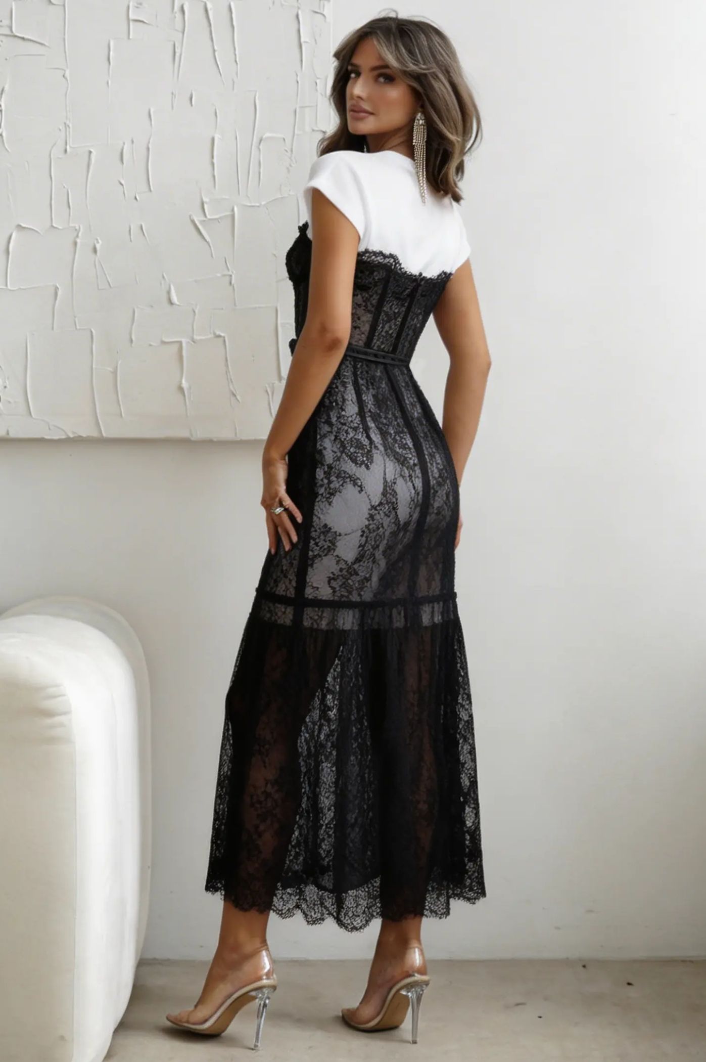 Απογείωσε το street style σου με αυτό το πρωτοποριακό midi φόρεμα, που αποτελεί την επιτομή του σύγχρονου layering. Ένας ευρηματικός συνδυασμός ενός basic λευκού t-shirt με ένα πολυτελές μαύρο δαντελωτό lingerie dress, δημιουργεί ένα look που είναι ταυτόχρονα casual και άκρως σαγηνευτικό. Ενσωματωμένο λευκό t-shirt με κοντά μανίκια που λειτουργεί ως βάση για το διάφανο φόρεμα από δαντέλα. Μαύρη δαντέλα με floral μοτίβα και λεπτομέρειες corset στο μπούστο που αναδεικνύουν τη σιλουέτα. Το κάτω μέρος του φορέματος παίζει με τις διαφάνειες, προσφέροντας ένα αέρινο και κομψό αποτέλεσμα. Συνοδεύεται από λεπτή μαύρη ζώνη με διακοσμητικό 3D τριαντάφυλλο που τονίζει τη μέση. Το διαχρονικό "Black & White" προσφέρει ένα look που δεν περνά ποτέ απαρατήρητο.