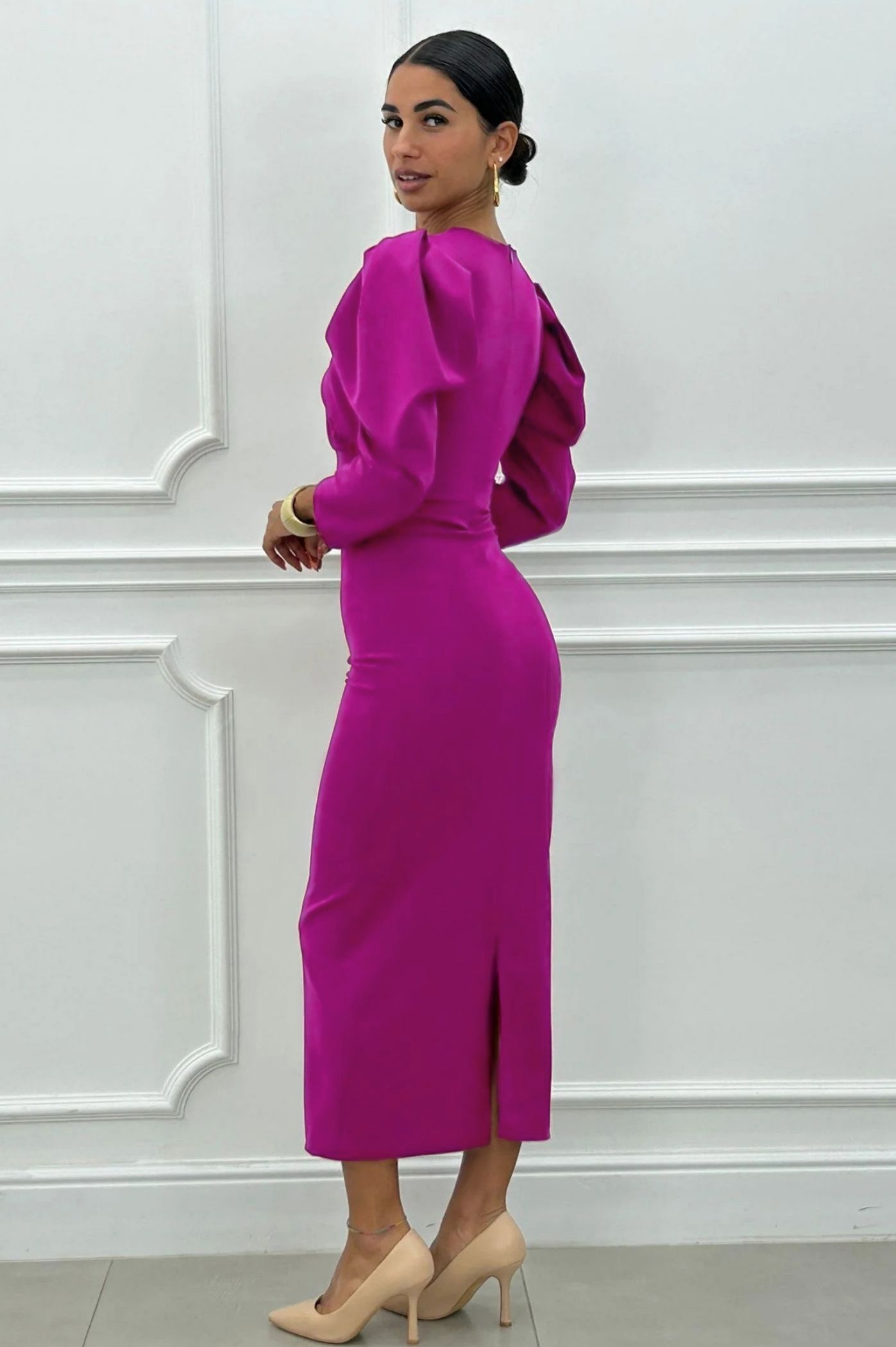Κομψό και διαχρονικό μίντι φόρεμα με έντονη έμφαση στη σιλουέτα. Το φόρεμα ξεχωρίζει χάρη στα εντυπωσιακά φουσκωτά μανίκια στους ώμους, που προσθέτουν όγκο και dramatic ύφος. Διαθέτει ένα ιδιαίτερο κόψιμο στο μπούστο και τονίζει τη μέση, προσφέροντας μια κολακευτική εφαρμογή. Το μήκος είναι midi με ίσια γραμμή, και στο πίσω μέρος του ποδιού διαθέτει σκίσιμο για άνεση στην κίνηση. Ιδανικό για κοκτέιλ πάρτι, επαγγελματικά events, ή επίσημες βραδινές εξόδους. Συνδυάζεται άψογα με χρυσά αξεσουάρ και έντονα χρωματιστά παπούτσια.
