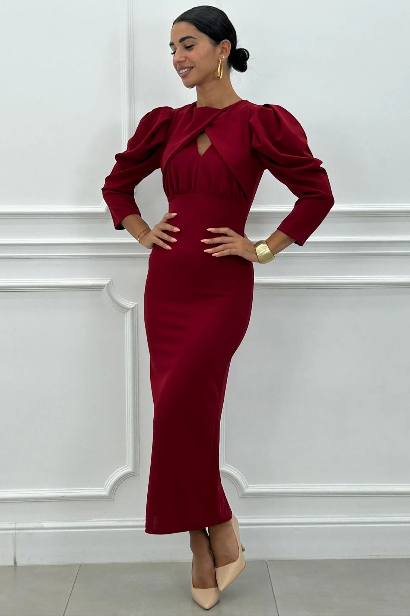 Κομψό και διαχρονικό μίντι φόρεμα με έντονη έμφαση στη σιλουέτα. Το φόρεμα ξεχωρίζει χάρη στα εντυπωσιακά φουσκωτά μανίκια στους ώμους, που προσθέτουν όγκο και dramatic ύφος. Διαθέτει ένα ιδιαίτερο κόψιμο στο μπούστο και τονίζει τη μέση, προσφέροντας μια κολακευτική εφαρμογή. Το μήκος είναι midi με ίσια γραμμή, και στο πίσω μέρος του ποδιού διαθέτει σκίσιμο για άνεση στην κίνηση. Ιδανικό για κοκτέιλ πάρτι, επαγγελματικά events, ή επίσημες βραδινές εξόδους. Συνδυάζεται άψογα με χρυσά αξεσουάρ και έντονα χρωματιστά παπούτσια.