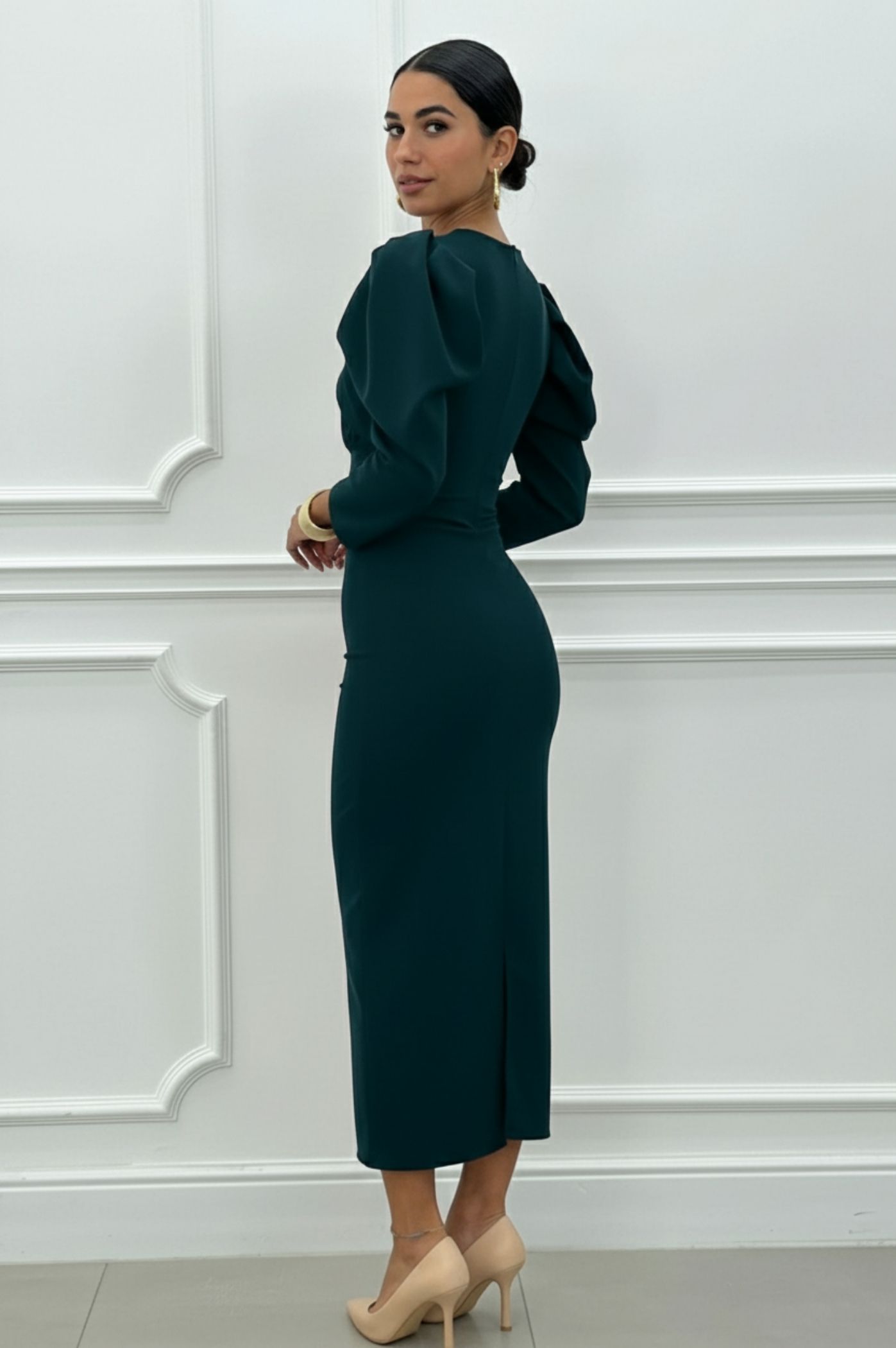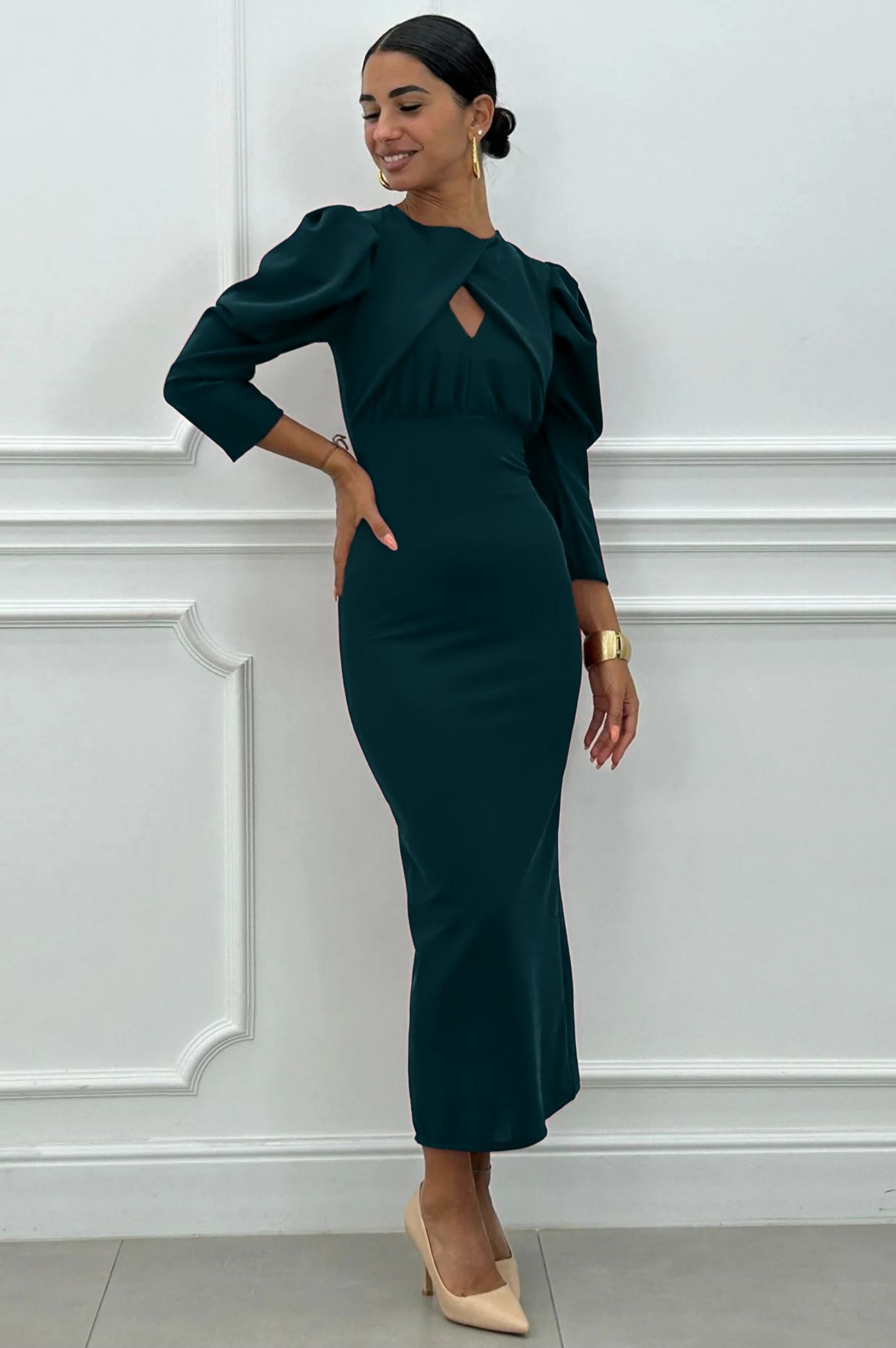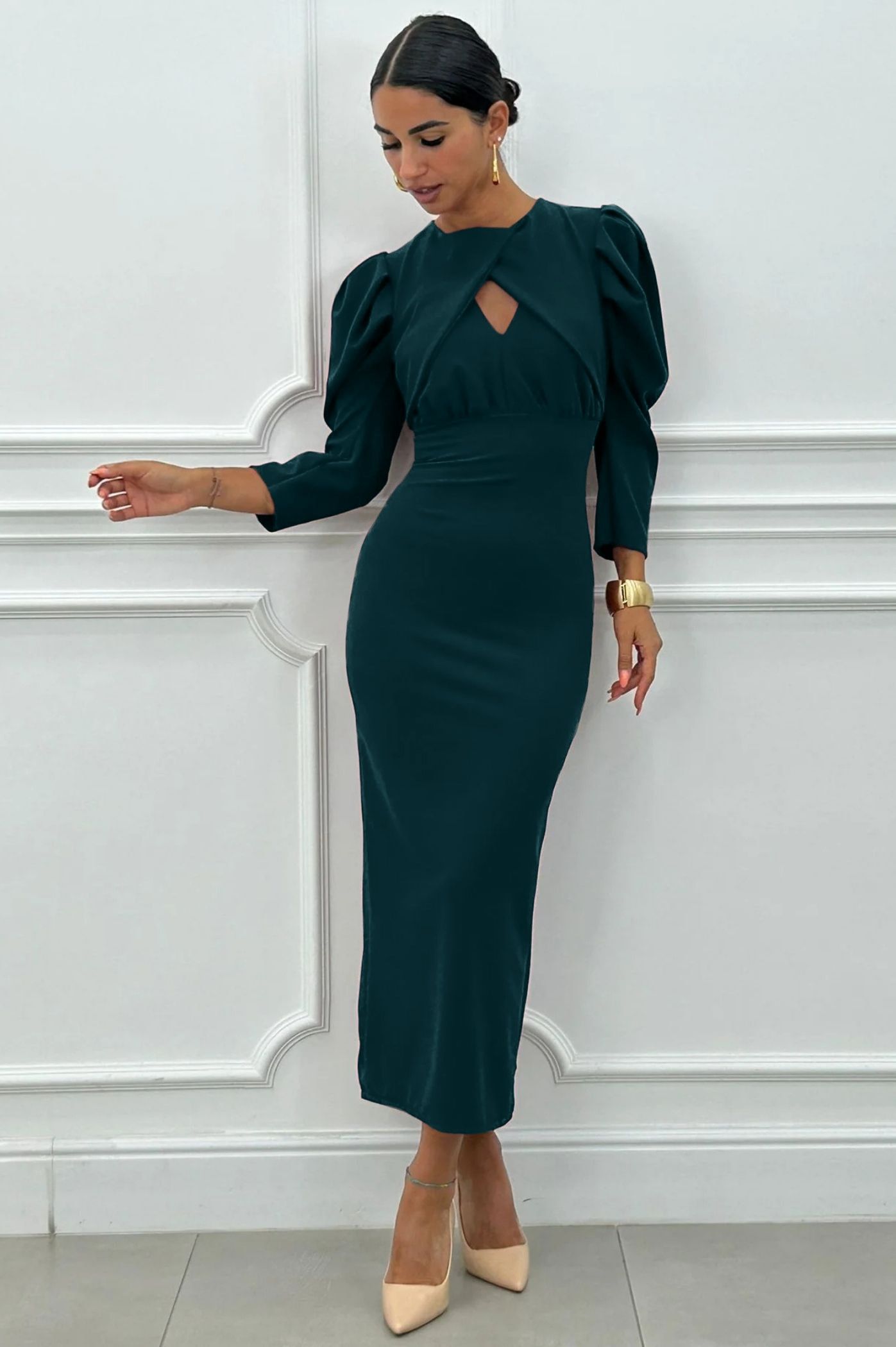 Κομψό και διαχρονικό μίντι φόρεμα με έντονη έμφαση στη σιλουέτα. Το φόρεμα ξεχωρίζει χάρη στα εντυπωσιακά φουσκωτά μανίκια στους ώμους, που προσθέτουν όγκο και dramatic ύφος. Διαθέτει ένα ιδιαίτερο κόψιμο στο μπούστο και τονίζει τη μέση, προσφέροντας μια κολακευτική εφαρμογή. Το μήκος είναι midi με ίσια γραμμή, και στο πίσω μέρος του ποδιού διαθέτει σκίσιμο για άνεση στην κίνηση. Ιδανικό για κοκτέιλ πάρτι, επαγγελματικά events, ή επίσημες βραδινές εξόδους. Συνδυάζεται άψογα με χρυσά αξεσουάρ και έντονα χρωματιστά παπούτσια.