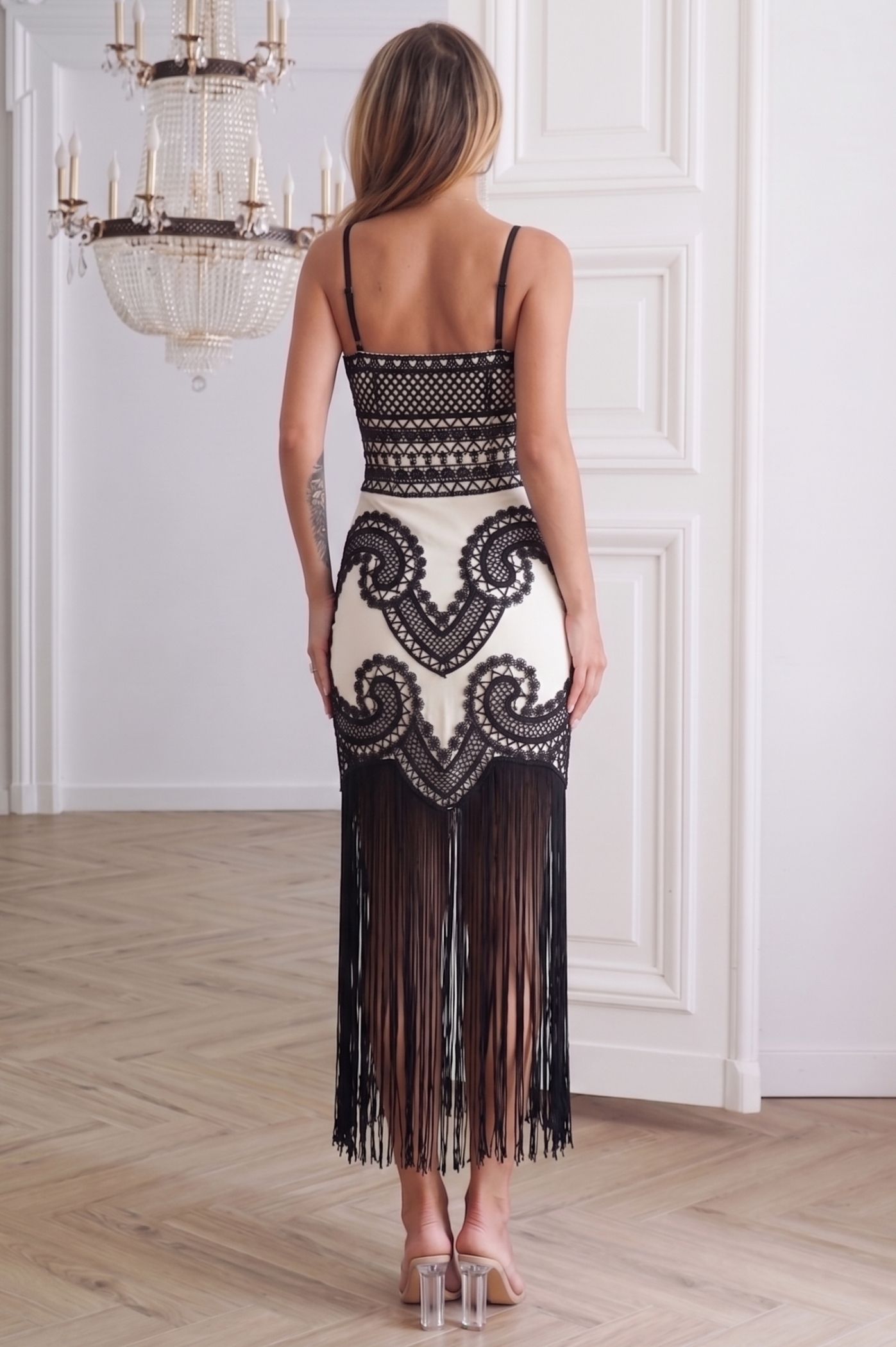 Ανακαλύψτε το απόλυτο statement κομμάτι για τις πιο ξεχωριστές σας εμφανίσεις. Αυτό το midi φόρεμα συνδυάζει την boho αισθητική με τη σύγχρονη κομψότητα, προσφέροντας ένα αποτέλεσμα που μαγνητίζει τα βλέμματα. Ο συνδυασμός του μαύρου κεντήματος με τη βάση σε κρεμ απόχρωση δημιουργεί ένα εντυπωσιακό γεωμετρικό μοτίβο που αγκαλιάζει το σώμα. Το τελείωμα με μακριά, αέρινα κρόσσια προσδίδει κίνηση και δυναμισμό στο βάδισμά σας, χαρίζοντας μια μοναδική αίσθηση πολυτέλειας. Διαθέτει λεπτές τιράντες και στενή γραμμή (pencil/fitted) που αναδεικνύει τη σιλουέτα, ενώ το ιδιαίτερο κέντημα στο μπούστο και στο σώμα προσθέτει βάθος και υφή στο ρούχο. Ιδανικό για βραδινές εξόδους, κοκτέιλ πάρτι ή εκδηλώσεις όπου θέλετε να ξεχωρίσετε με την πρωτοτυπία και το στυλ σας.