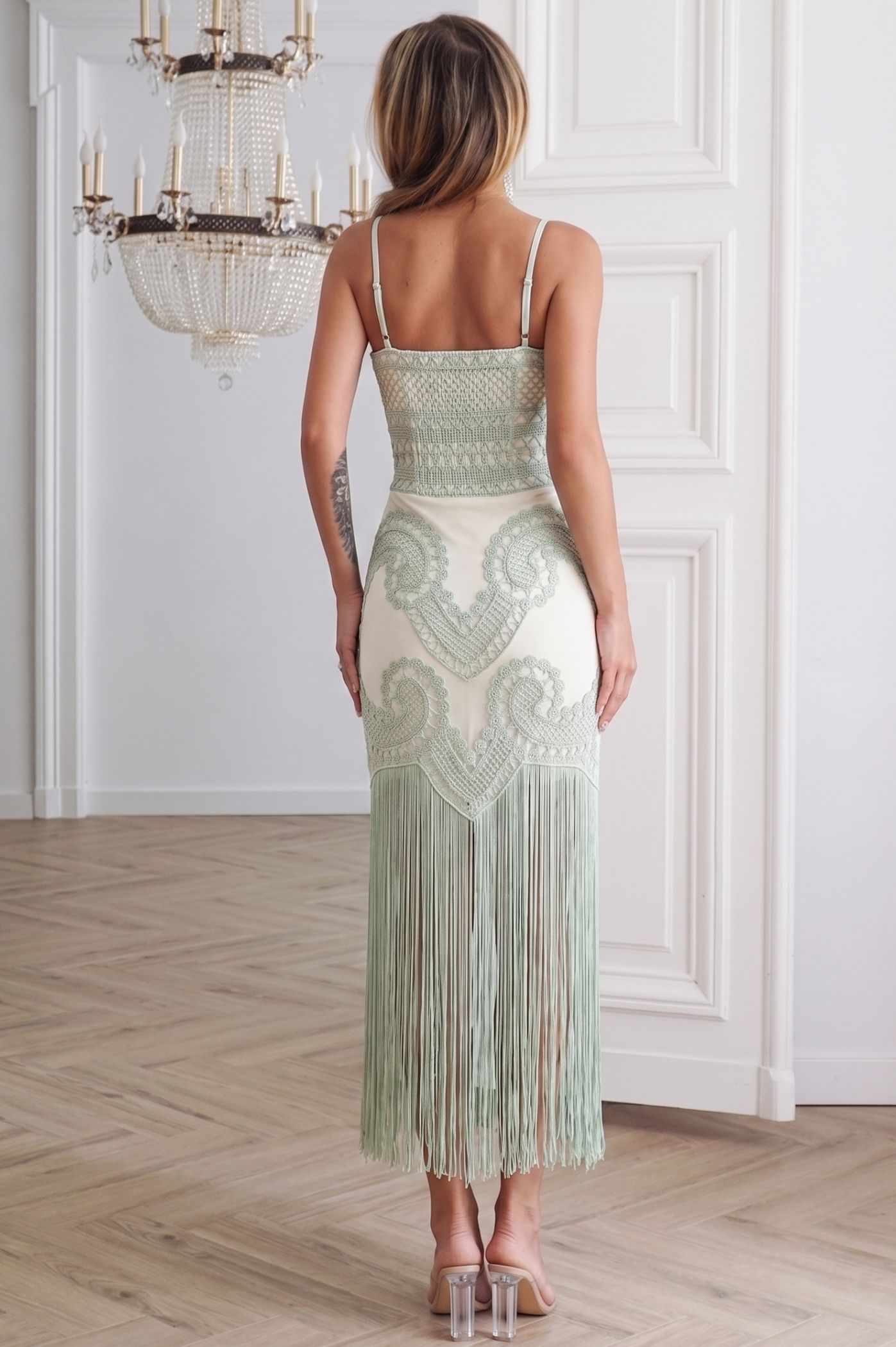 Ανακαλύψτε το απόλυτο statement κομμάτι για τις πιο ξεχωριστές σας εμφανίσεις. Αυτό το midi φόρεμα συνδυάζει την boho αισθητική με τη σύγχρονη κομψότητα, προσφέροντας ένα αποτέλεσμα που μαγνητίζει τα βλέμματα. Ο συνδυασμός του καφέ κεντήματος με τη βάση σε κρεμ απόχρωση δημιουργεί ένα εντυπωσιακό γεωμετρικό μοτίβο που αγκαλιάζει το σώμα. Το τελείωμα με μακριά, αέρινα κρόσσια προσδίδει κίνηση και δυναμισμό στο βάδισμά σας, χαρίζοντας μια μοναδική αίσθηση πολυτέλειας. Διαθέτει λεπτές τιράντες και στενή γραμμή (pencil/fitted) που αναδεικνύει τη σιλουέτα, ενώ το ιδιαίτερο κέντημα στο μπούστο και στο σώμα προσθέτει βάθος και υφή στο ρούχο. Ιδανικό για βραδινές εξόδους, κοκτέιλ πάρτι ή εκδηλώσεις όπου θέλετε να ξεχωρίσετε με την πρωτοτυπία και το στυλ σας.