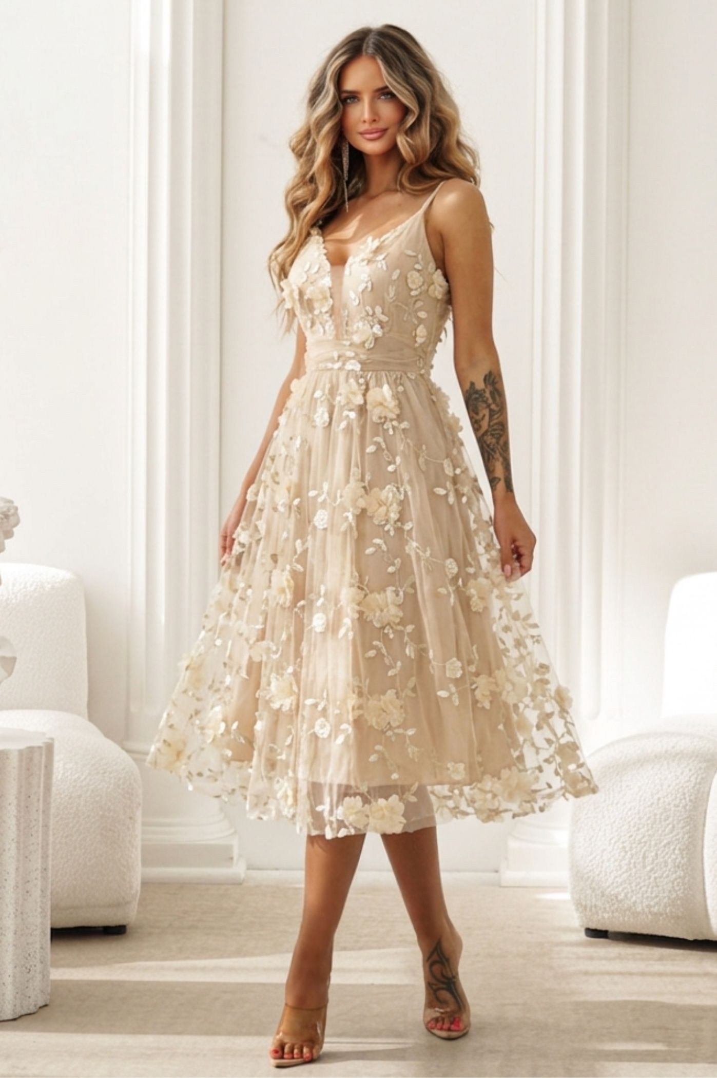 Αναδείξτε την εμφάνισή σας σε ένα παραμύθι με αυτό το εκθαμβωτικό midi φόρεμα. Ένα κομμάτι υψηλής αισθητικής που συνδυάζει την πολυτέλεια του κεντήματος με τη διαχρονική κομψότητα του τούλιου, ιδανικό για τις πιο ξεχωριστές στιγμές σας. Το φόρεμα είναι διακοσμημένο με ανάγλυφα τρισδιάστατα λουλούδια και ασημί κεντημένες λεπτομέρειες που χαρίζουν βάθος και λάμψη. Το μπούστο διαθέτει διακριτική διαφάνεια στο κέντρο και λεπτές τιράντες, προσφέροντας σταθερότητα και ένα αισθησιακό αλλά κομψό αποτέλεσμα. Η εξωτερική στρώση από πολυτελές τούλι πέφτει ανάλαφρα πάνω από τη φόδρα, δημιουργώντας ένα παιχνίδισμα με τη διαφάνεια στο τελείωμα. Η κλασική γραμμή άλφα τονίζει τη μέση και ανοίγει ομοιόμορφα, κολακεύοντας κάθε σωματότυπο με την κίνησή της.