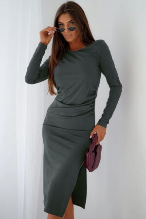 Αναδείξτε το στυλ σας με αυτό το midi  φόρεμα που είναι η επιτομή της κομψότητας. Οι διακριτικές βάτες στους ώμους προσδίδουν όγκο και στυλ, ενώ το μαλακό ύφασμα αγκαλιάζει απαλά τη σιλουέτα σας. Το εντυπωσιακό σκίσιμο στο πόδι και η σούρα στη μέση δίνουν έναν αέρα φινέτσας και θηλυκότητας. Ιδανικό για μια βραδινή έξοδο ή μια επίσημη εκδήλωση.