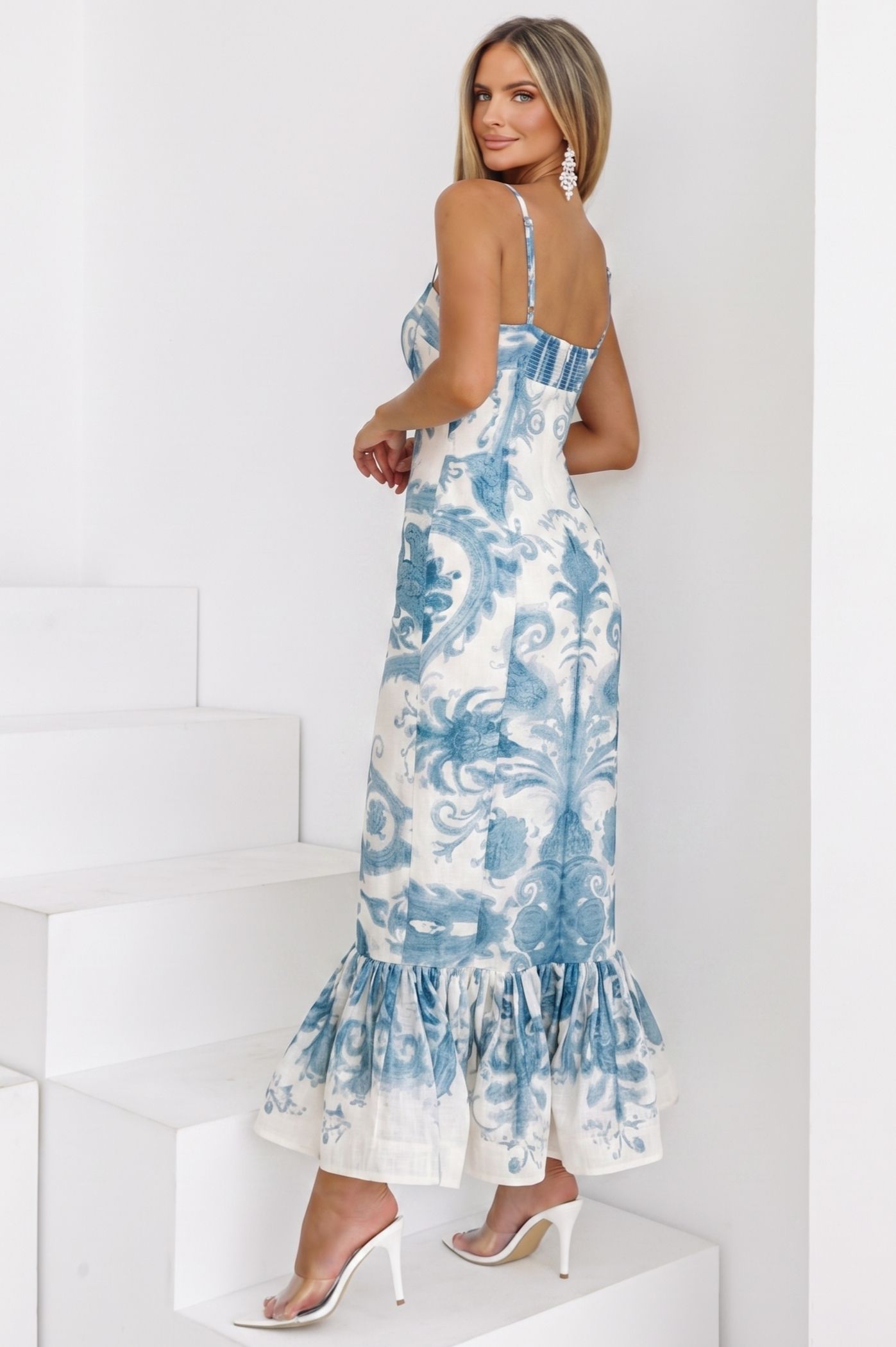Κλέψτε την παράσταση με αυτό το εκλεπτυσμένο midi φόρεμα, που συνδυάζει την κλασική κομψότητα με τις σύγχρονες τάσεις της μόδας. Το μοναδικό του print σε αποχρώσεις του μπλε και του λευκού προσδίδει μια αριστοκρατική αισθητική, καθιστώντας το την ιδανική επιλογή για κάθε επίσημη ή κοινωνική εκδήλωση. Το μπούστο σε στυλ κορσέ αναδεικνύει τη σιλουέτα και προσφέρει θηλυκή εφαρμογή, ενώ οι λεπτές τιράντες εξασφαλίζουν σταθερότητα και χάρη. Το περίτεχνο μοτίβο σε μπλε και λευκούς τόνους χαρίζει μια αίσθηση πολυτέλειας και διαχρονικού στυλ. Το τελείωμα με βολάν στο κάτω μέρος προσθέτει κίνηση και ρομαντική διάθεση σε κάθε σας βήμα, δημιουργώντας μια υπέροχη ισορροπία μεταξύ της στενής γραμμής στο σώμα και του όγκου στο τελείωμα. Το midi μήκος το καθιστά ευέλικτο για ποικίλες περιστάσεις, από δεξιώσεις και γάμους μέχρι κομψές βραδινές εξόδους.