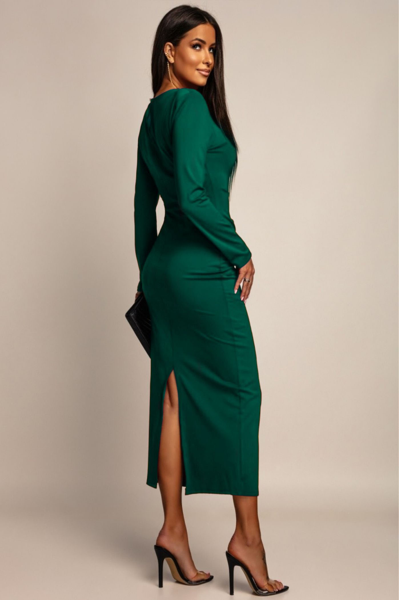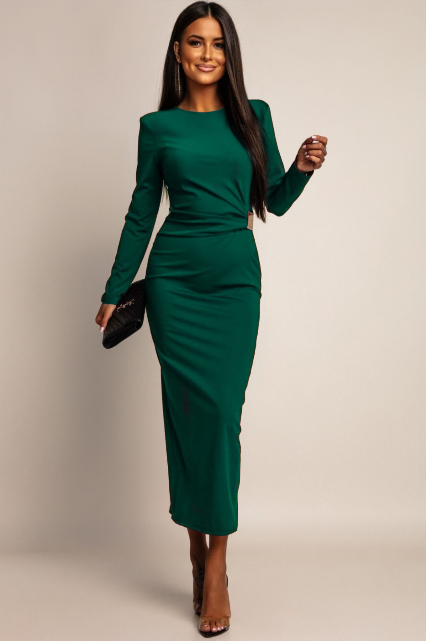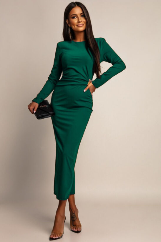 Αναδείξτε το δυναμικό και κομψό σας στυλ με αυτό το εντυπωσιακό μίντι φόρεμα. Το φόρεμα διαθέτει μια κολακευτική pencil γραμμή που αγκαλιάζει τη σιλουέτα, ενώ οι βάτες στους ώμους δημιουργούν μια δυναμική και στιβαρή εμφάνιση. Η σούρα στη μέση τονίζει την περιφέρεια και προσθέτει μια ενδιαφέρουσα λεπτομέρεια που κολακεύει κάθε σωματότυπο. Ιδανικό για το γραφείο, μια βραδινή έξοδο ή μια κομψή casual εμφάνιση.