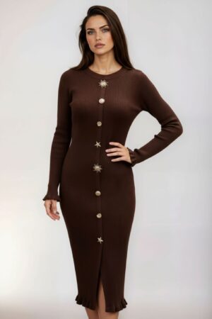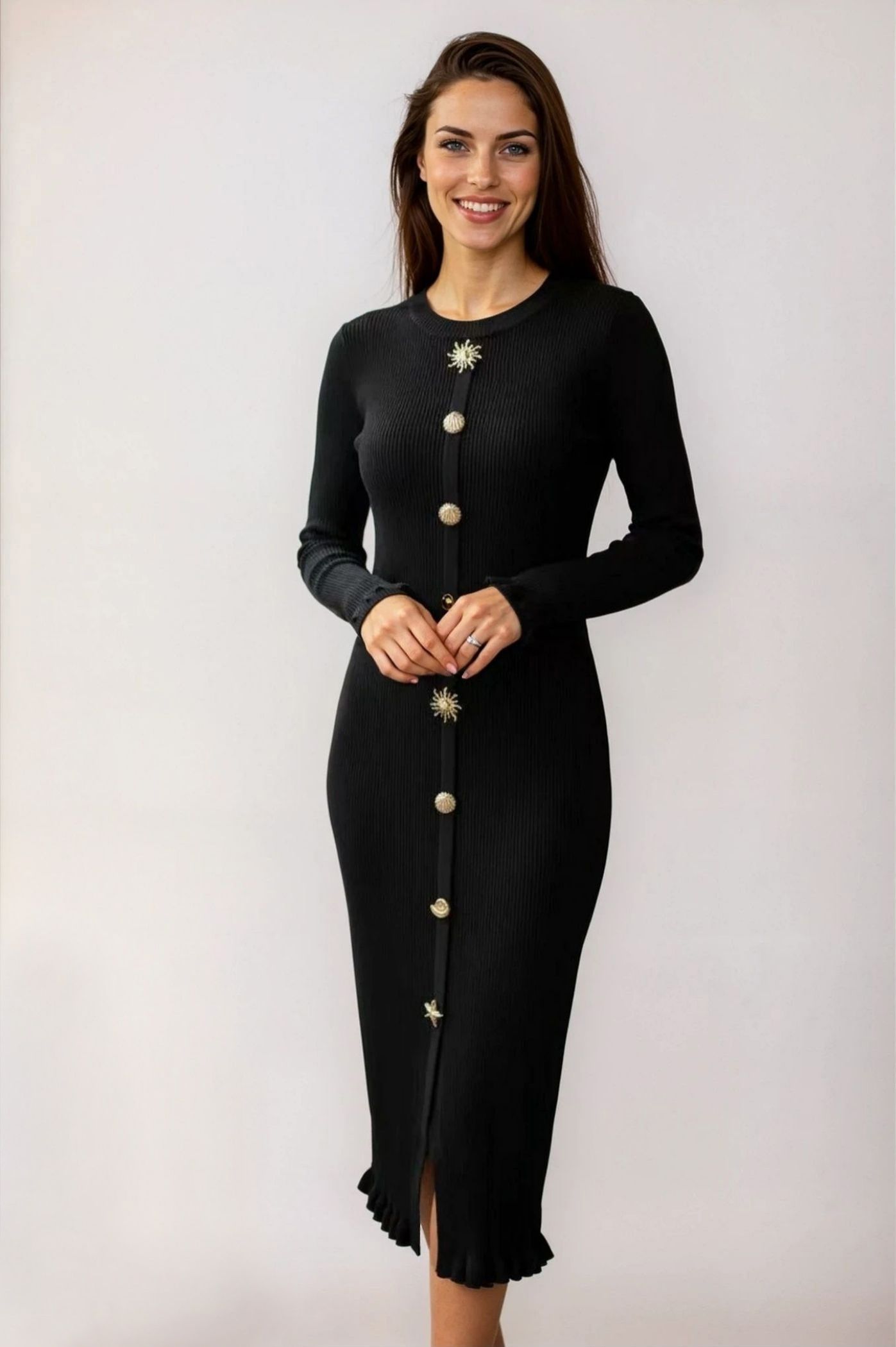Αναδείξτε ένα εντυπωσιακό και ταυτόχρονα άνετο look με αυτό το μίντι φόρεμα από ελαστικό πλεκτό ύφασμα. Η στενή και εφαρμοστή γραμμή αγκαλιάζει ιδανικά τη σιλουέτα, ενώ το μήκος μίντι και το διακριτικό σκίσιμο μπροστά προσδίδουν θηλυκότητα. Το φόρεμα ξεχωρίζει για δύο βασικά στοιχεία, για τα εντυπωσιακά κουμπιά-κόσμημα σε χρυσό τόνο με σχήματα ή strass, που δίνουν έναν αέρα luxury και vintage chic, καθώς και για το κομψό τελείωμα με μικρό βολάν στο στρίφωμα, το οποίο προσθέτει κίνηση και ρομαντική πινελιά. Ιδανικό για office look, βραδινές εξόδους ή οποιαδήποτε περίσταση απαιτεί κομψότητα.