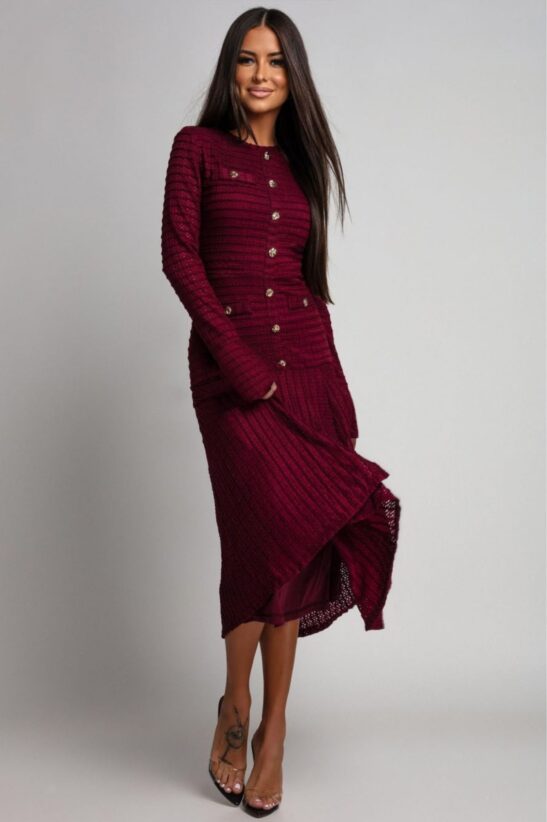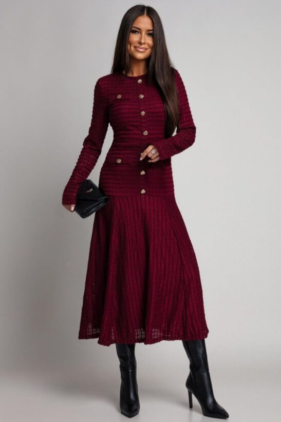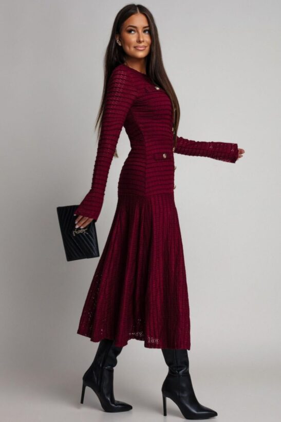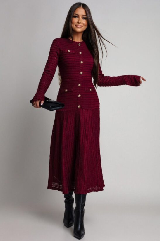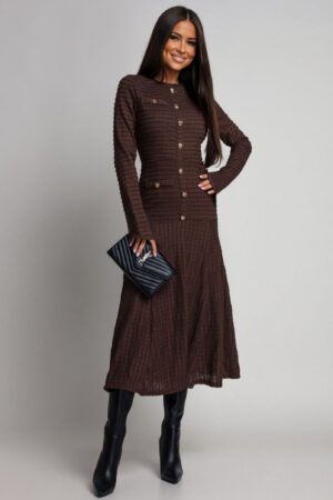 Αναδείξτε το στυλ σας με το πλεκτό midi φόρεμα. Διαθέτει στρογγυλή λαιμόκοψη και εφαρμοστό πάνω μέρος, καθώς και μια αέρινη κλος φούστα σε midi μήκος, χαρίζοντας κίνηση και θηλυκότητα. Τα χρυσά διακοσμητικά κουμπιά στον κορμό προσθέτουν μια αίσθηση πολυτέλειας, θυμίζοντας ταγιέρ. Συνδυάστε το με ψηλές μπότες και ένα statement τσαντάκι για ένα ολοκληρωμένο, εντυπωσιακό χειμερινό στυλ. Ιδανικό για τις επίσημες εμφανίσεις του γραφείου, αλλά και για κομψές βραδινές εξόδους.