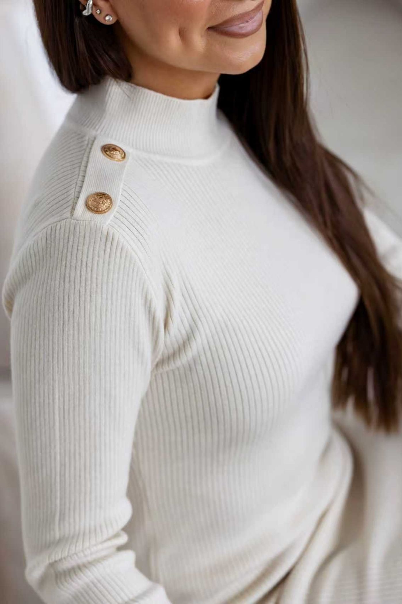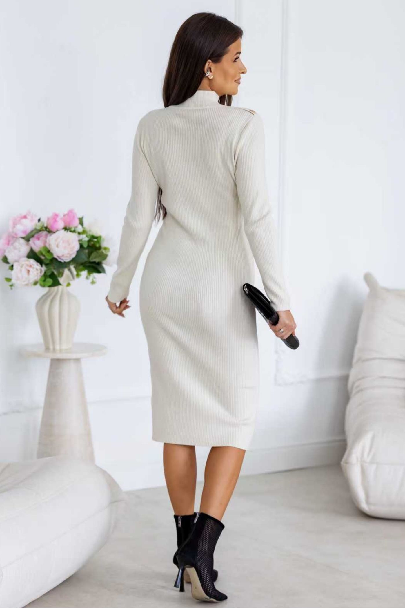 Αναδείξτε το στυλ σας με αυτό το κομψό ριμπ πλεκτό μίντι φόρεμα. Η στενή γραμμή αγκαλιάζει το σώμα, ενώ η ριμπ πλέξη προσφέρει υπέροχη υφή και ελαστικότητα για τέλεια εφαρμογή. Διαθέτει ψηλό λαιμό τύπου ζιβάγκο και μακρύ μανίκι, καθιστώντας το ιδανικό για τους κρύους μήνες. Η λεπτομέρεια που κάνει τη διαφορά είναι τα διακοσμητικά χρυσά κουμπιά στους ώμους, που προσδίδουν μια εκλεπτυσμένη, στρατιωτική πινελιά. Ιδανικό για το γραφείο, χαλαρές συναντήσεις ή ακόμα και για βραδινές εξόδους. Συνδυάστε το με μπότες ή μποτάκια για ένα ολοκληρωμένο, στυλάτο look.