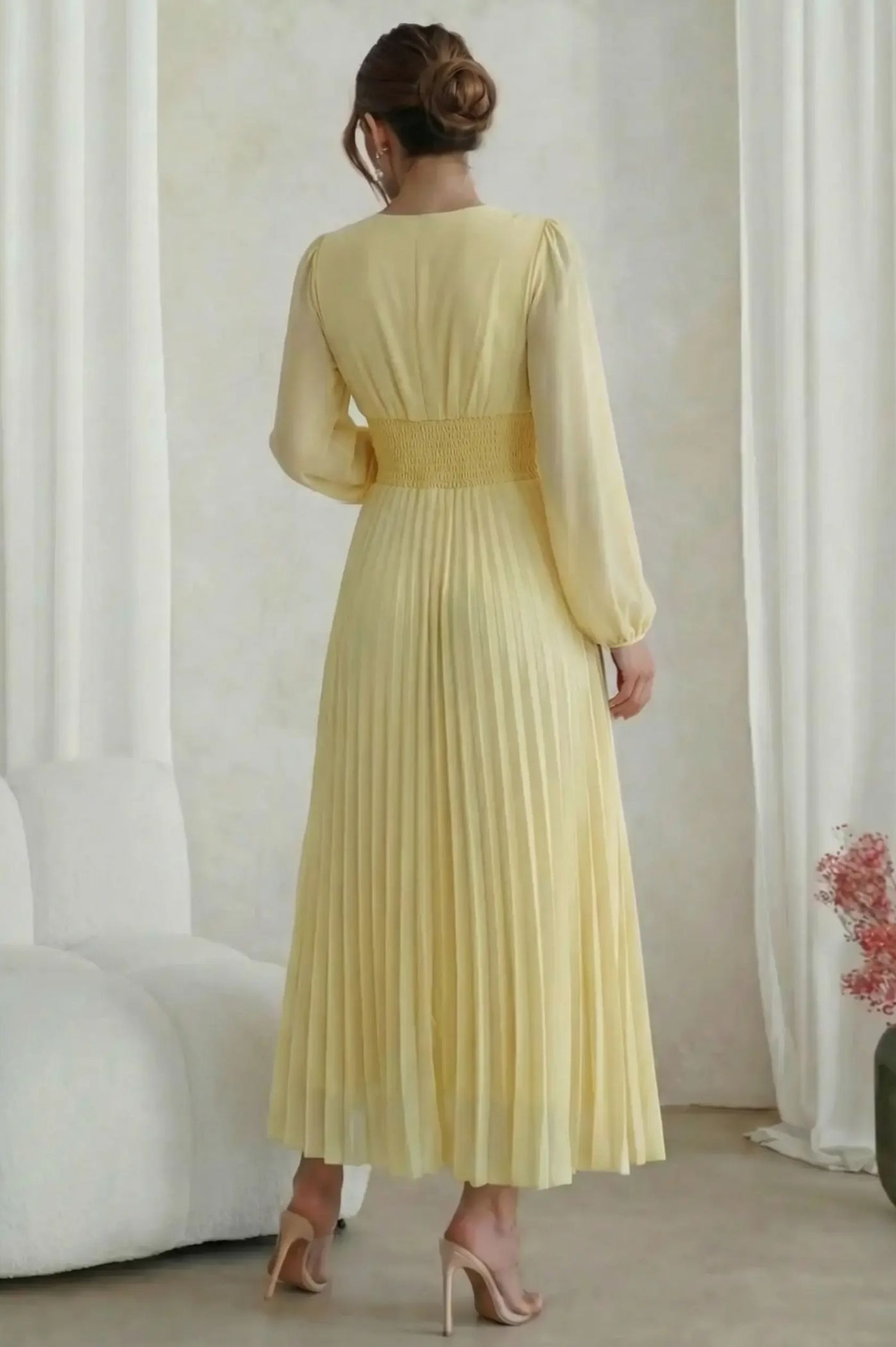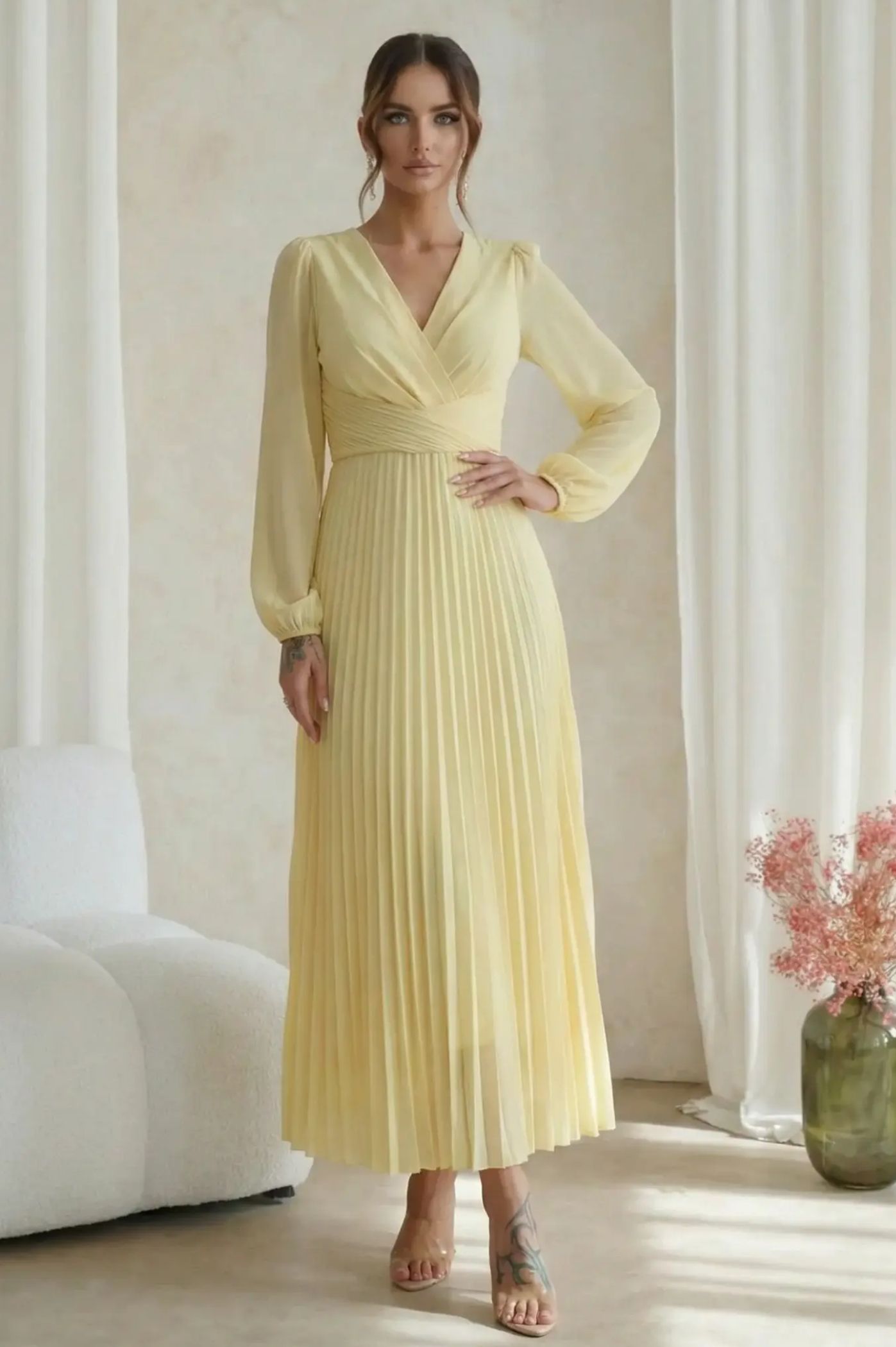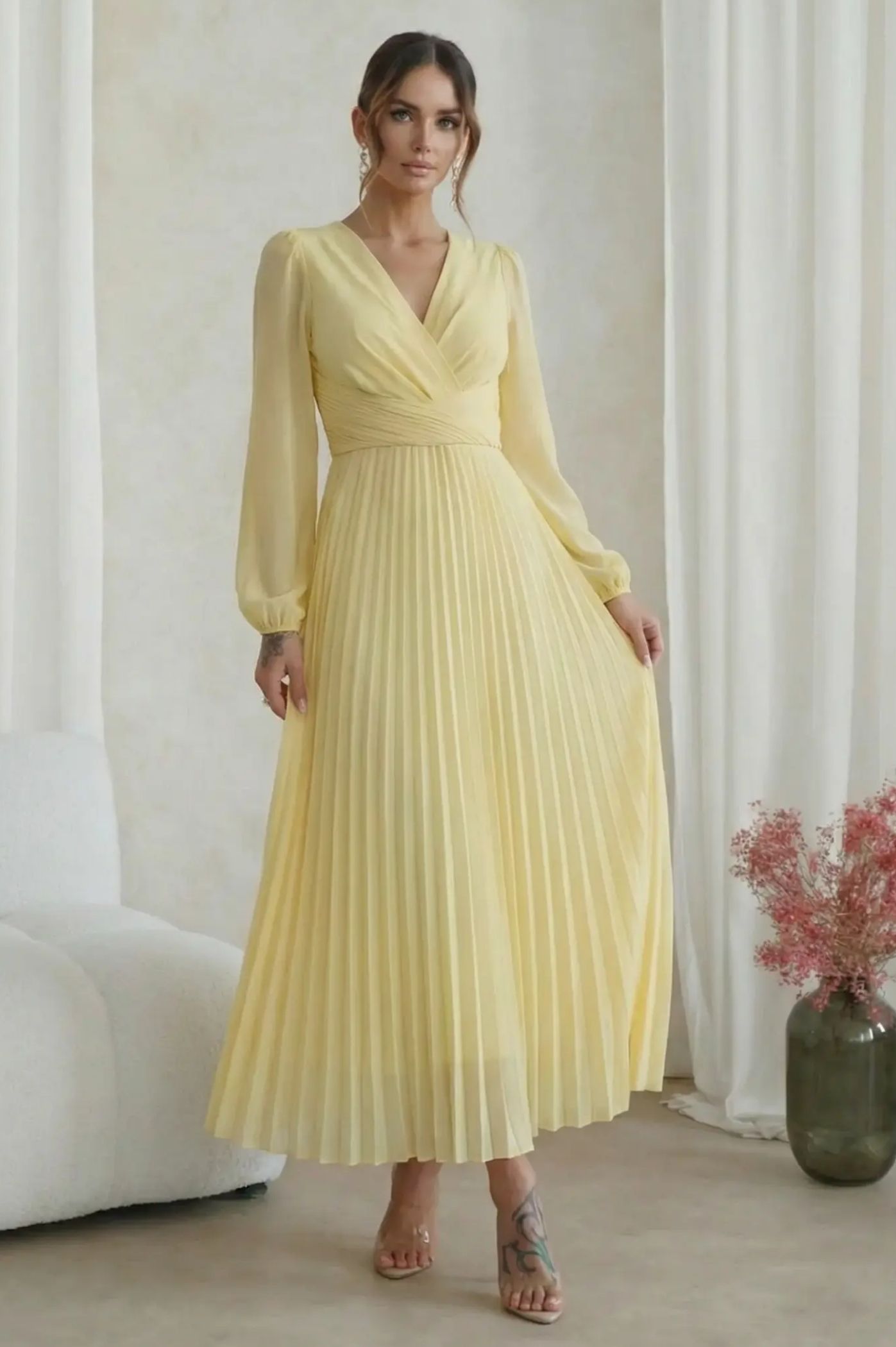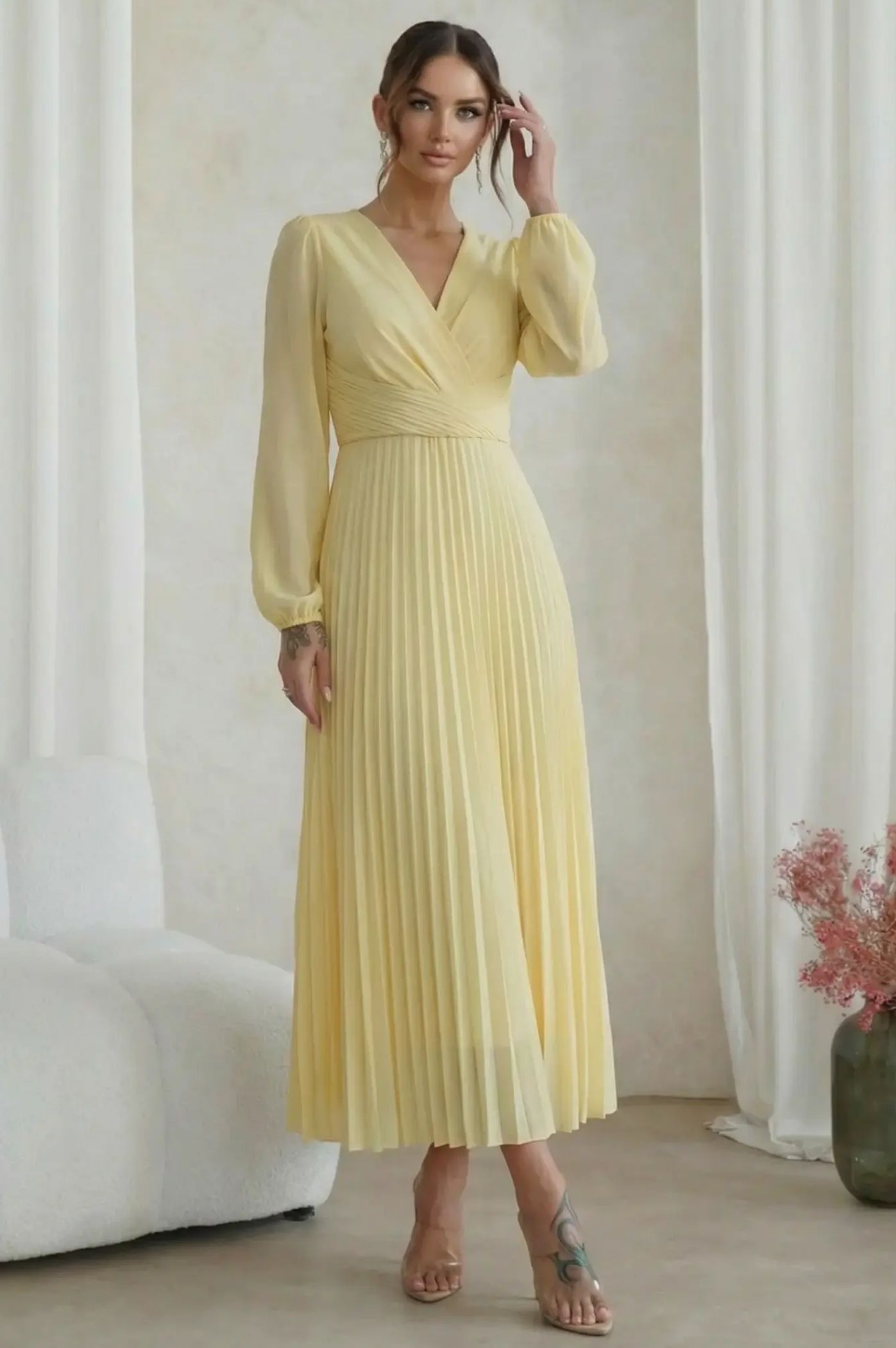 Ανακαλύψτε την απόλυτη ρομαντική εμφάνιση με το μίντι πλισέ φόρεμα. Με αέρινη αίσθηση και σικ λεπτομέρειες, είναι η τέλεια πρόταση για κουμπάρες, νονές ή επίσημες κοινωνικές εκδηλώσεις. Το κρουαζέ σχέδιο στο πάνω μέρος δημιουργεί μια θηλυκή λαιμόκοψη V και τονίζει όμορφα τη μέση. Η εντυπωσιακή πλισέ φούστα χαρίζει μοναδική κίνηση και μια αριστοκρατική νότα σε κάθε σας βήμα. Τα μακριά διάφανα μανίκια με ελαφρύ όγκο προσδίδουν μια σοφιστικέ αισθητική, ιδανική για απογευματινά events.