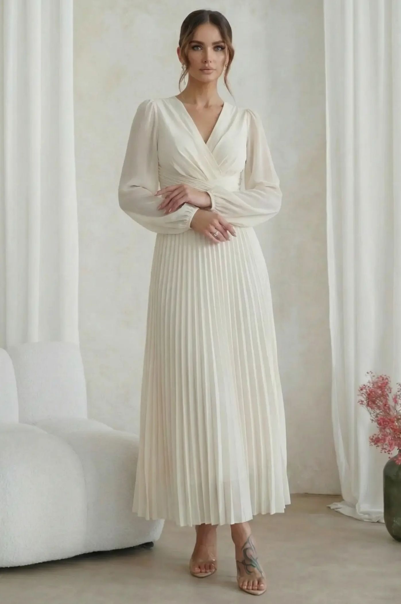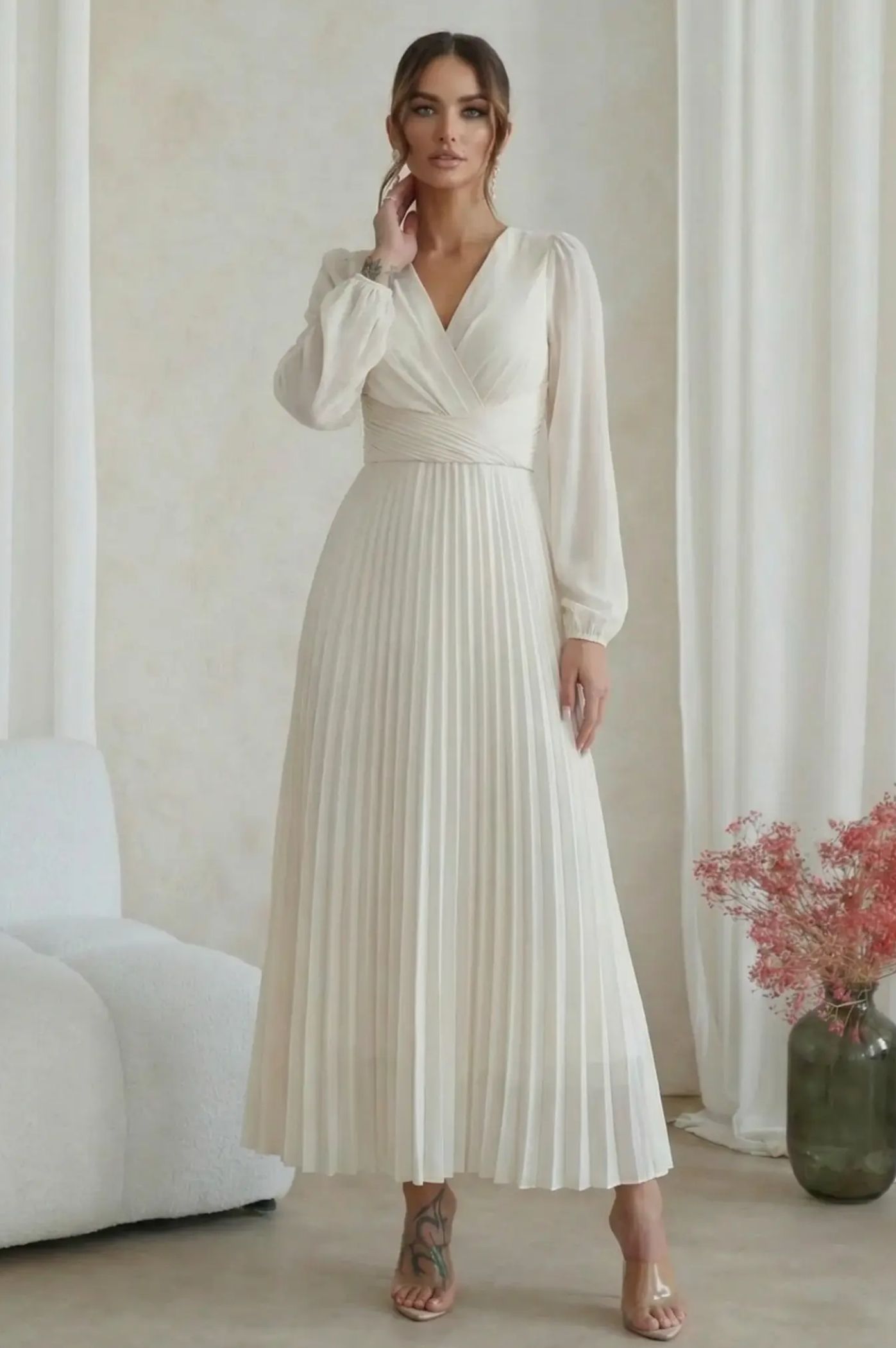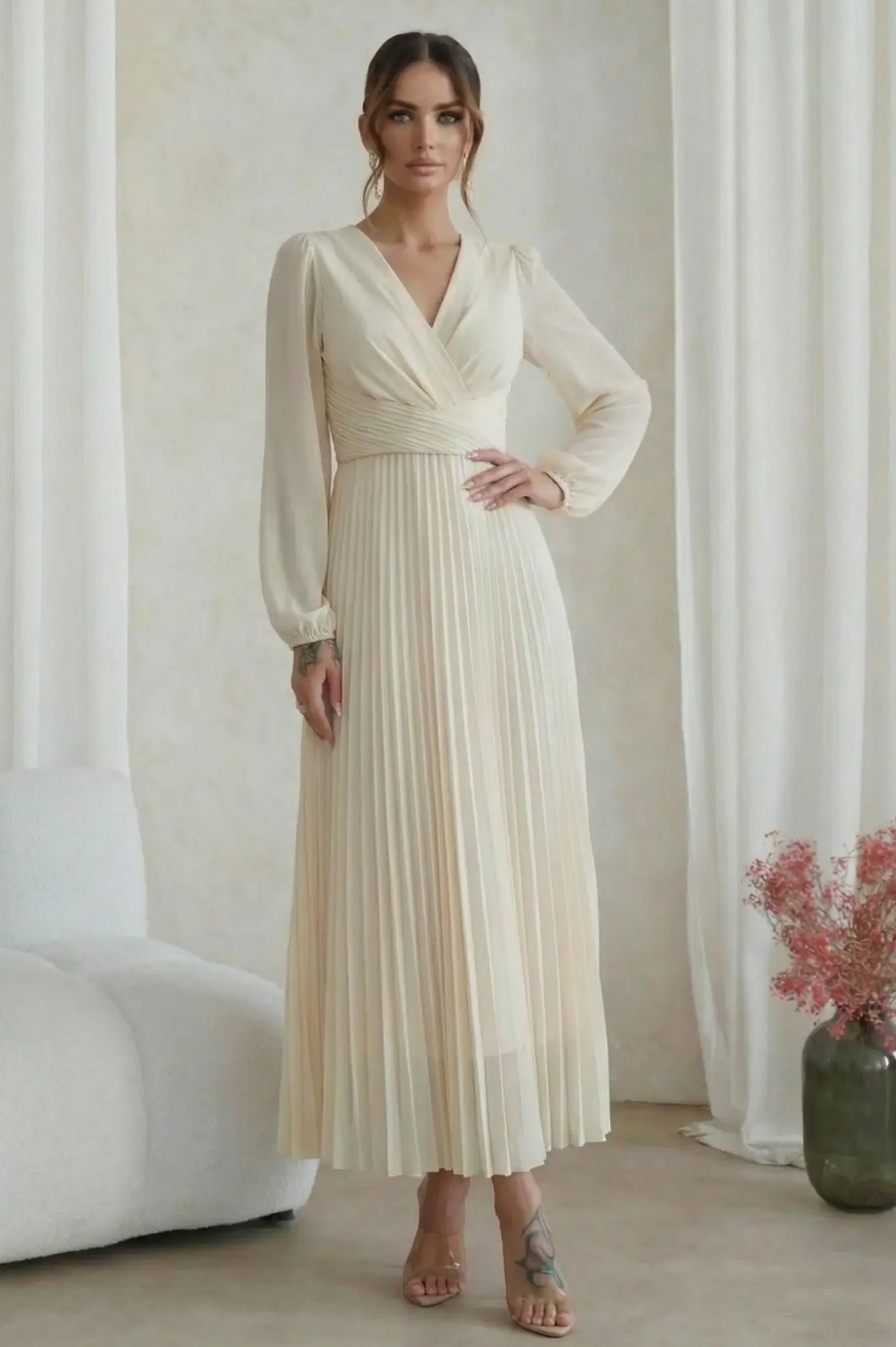 Ανακαλύψτε την απόλυτη ρομαντική εμφάνιση με το μίντι πλισέ φόρεμα. Με αέρινη αίσθηση και σικ λεπτομέρειες, είναι η τέλεια πρόταση για κουμπάρες, νονές ή επίσημες κοινωνικές εκδηλώσεις. Το κρουαζέ σχέδιο στο πάνω μέρος δημιουργεί μια θηλυκή λαιμόκοψη V και τονίζει όμορφα τη μέση. Η εντυπωσιακή πλισέ φούστα χαρίζει μοναδική κίνηση και μια αριστοκρατική νότα σε κάθε σας βήμα. Τα μακριά διάφανα μανίκια με ελαφρύ όγκο προσδίδουν μια σοφιστικέ αισθητική, ιδανική για απογευματινά events.