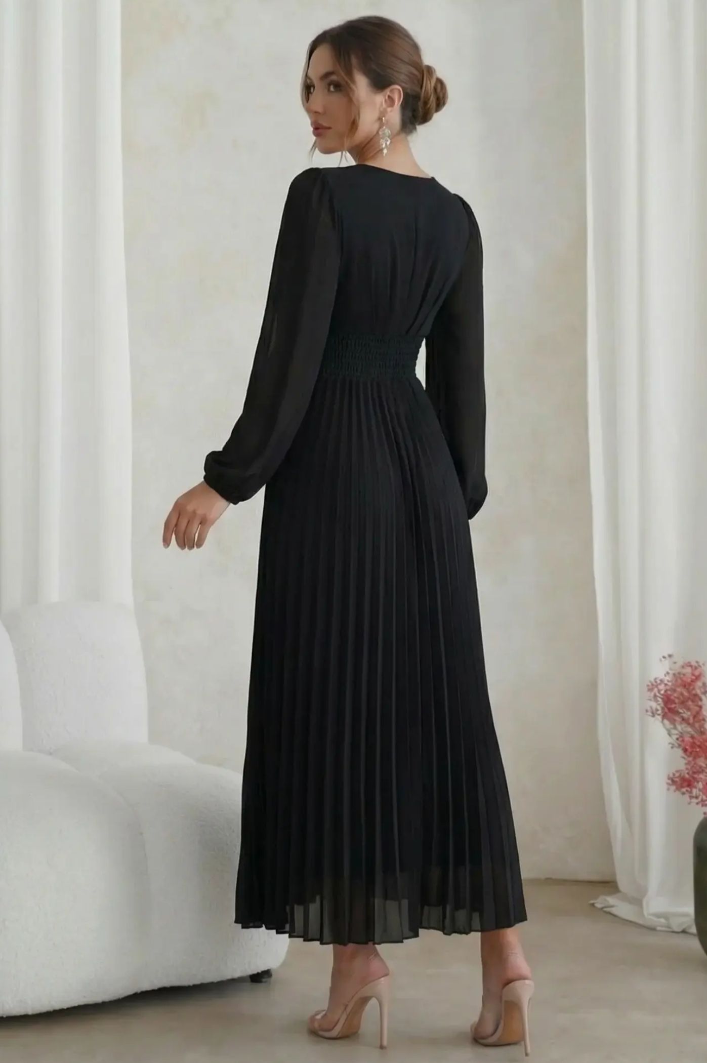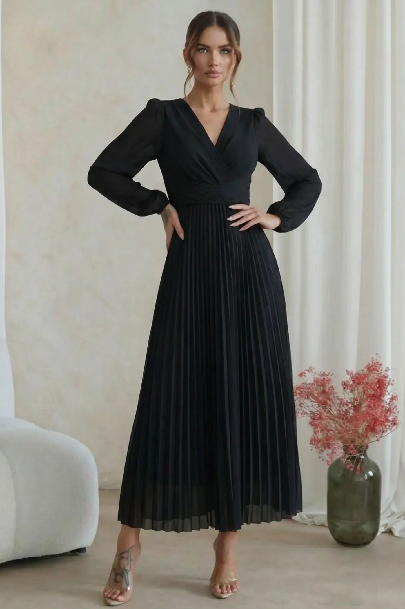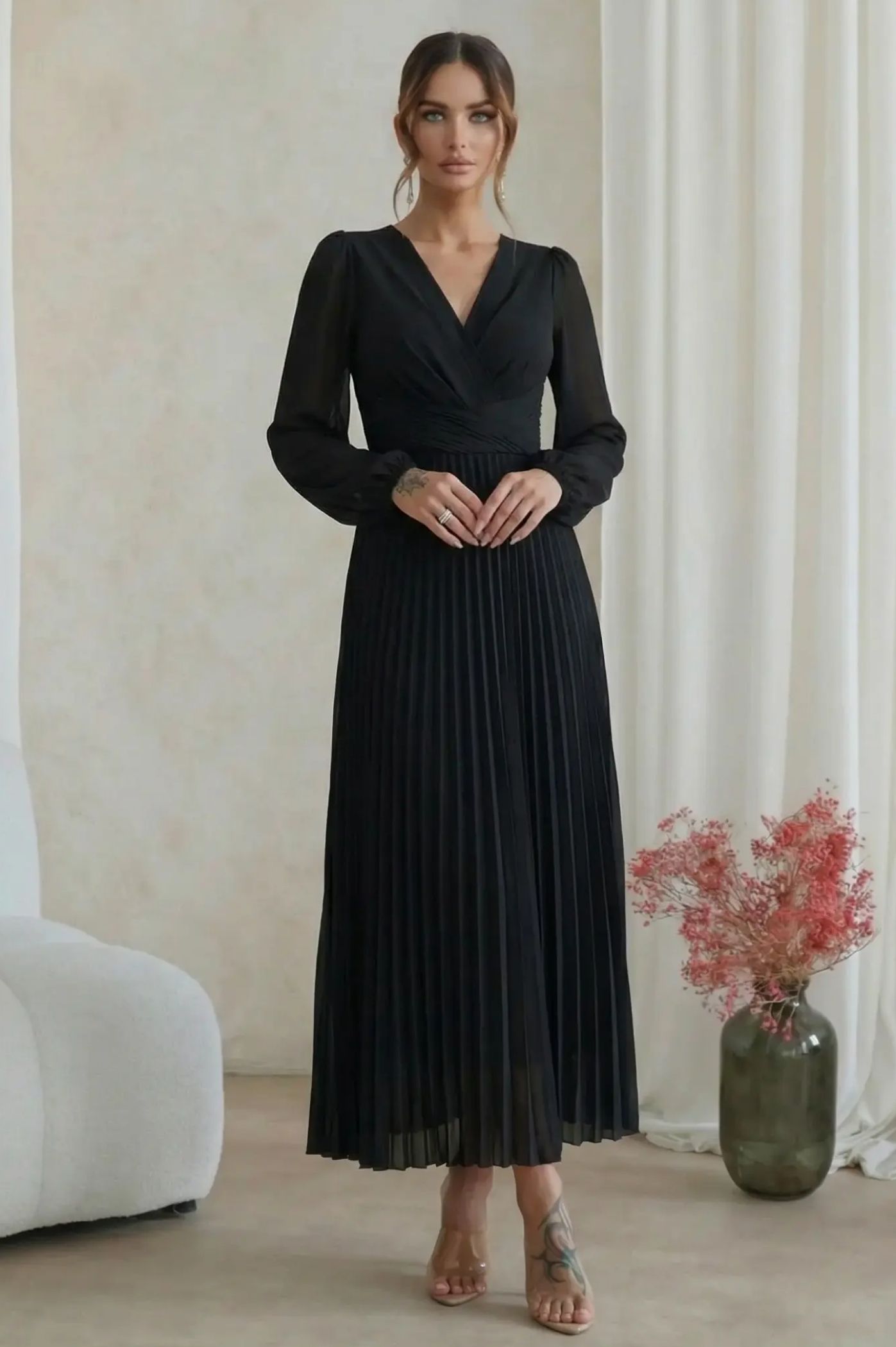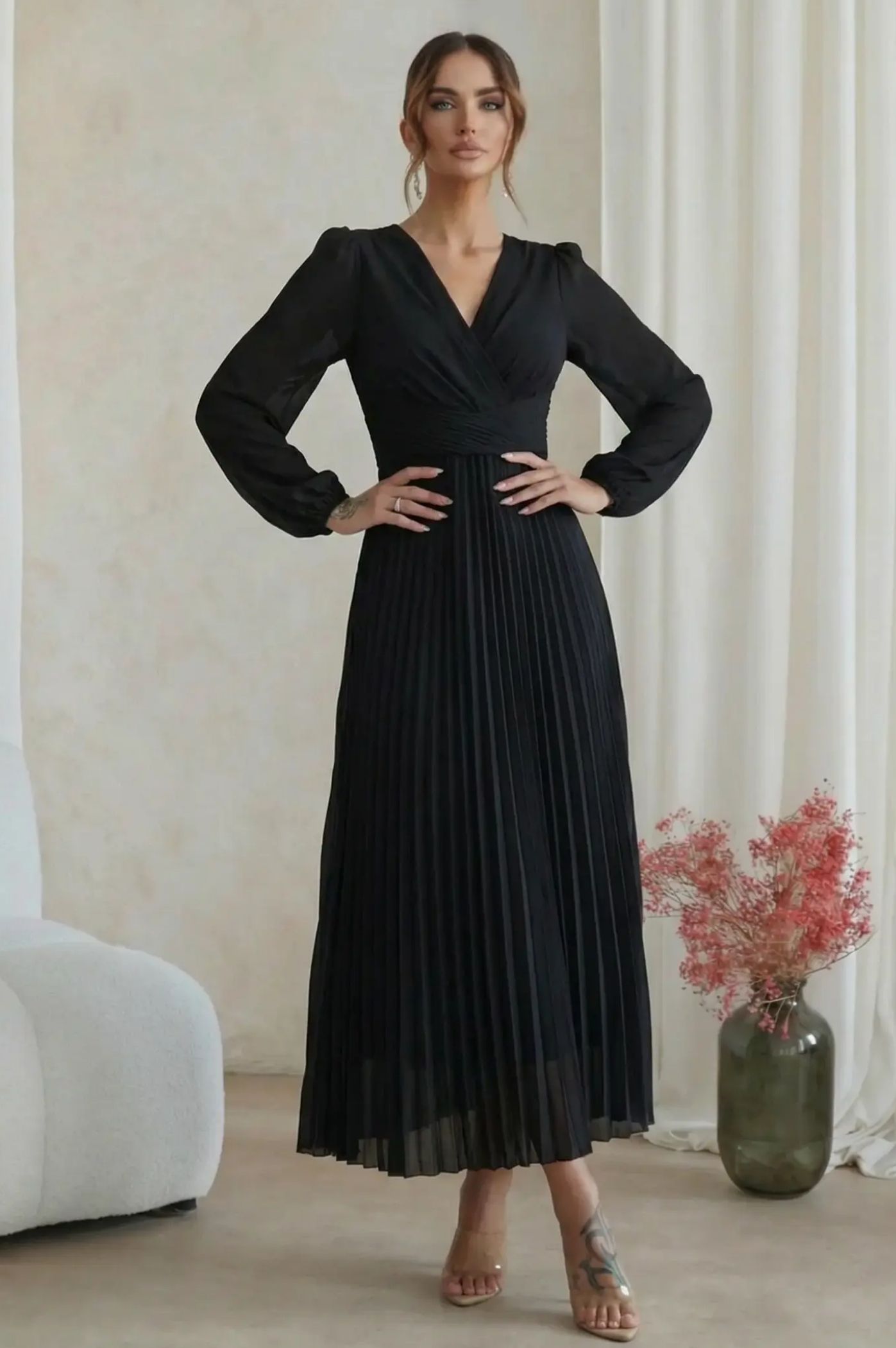 Ανακαλύψτε την απόλυτη ρομαντική εμφάνιση με το μίντι πλισέ φόρεμα. Με αέρινη αίσθηση και σικ λεπτομέρειες, είναι η τέλεια πρόταση για κουμπάρες, νονές ή επίσημες κοινωνικές εκδηλώσεις. Το κρουαζέ σχέδιο στο πάνω μέρος δημιουργεί μια θηλυκή λαιμόκοψη V και τονίζει όμορφα τη μέση. Η εντυπωσιακή πλισέ φούστα χαρίζει μοναδική κίνηση και μια αριστοκρατική νότα σε κάθε σας βήμα. Τα μακριά διάφανα μανίκια με ελαφρύ όγκο προσδίδουν μια σοφιστικέ αισθητική, ιδανική για απογευματινά events.