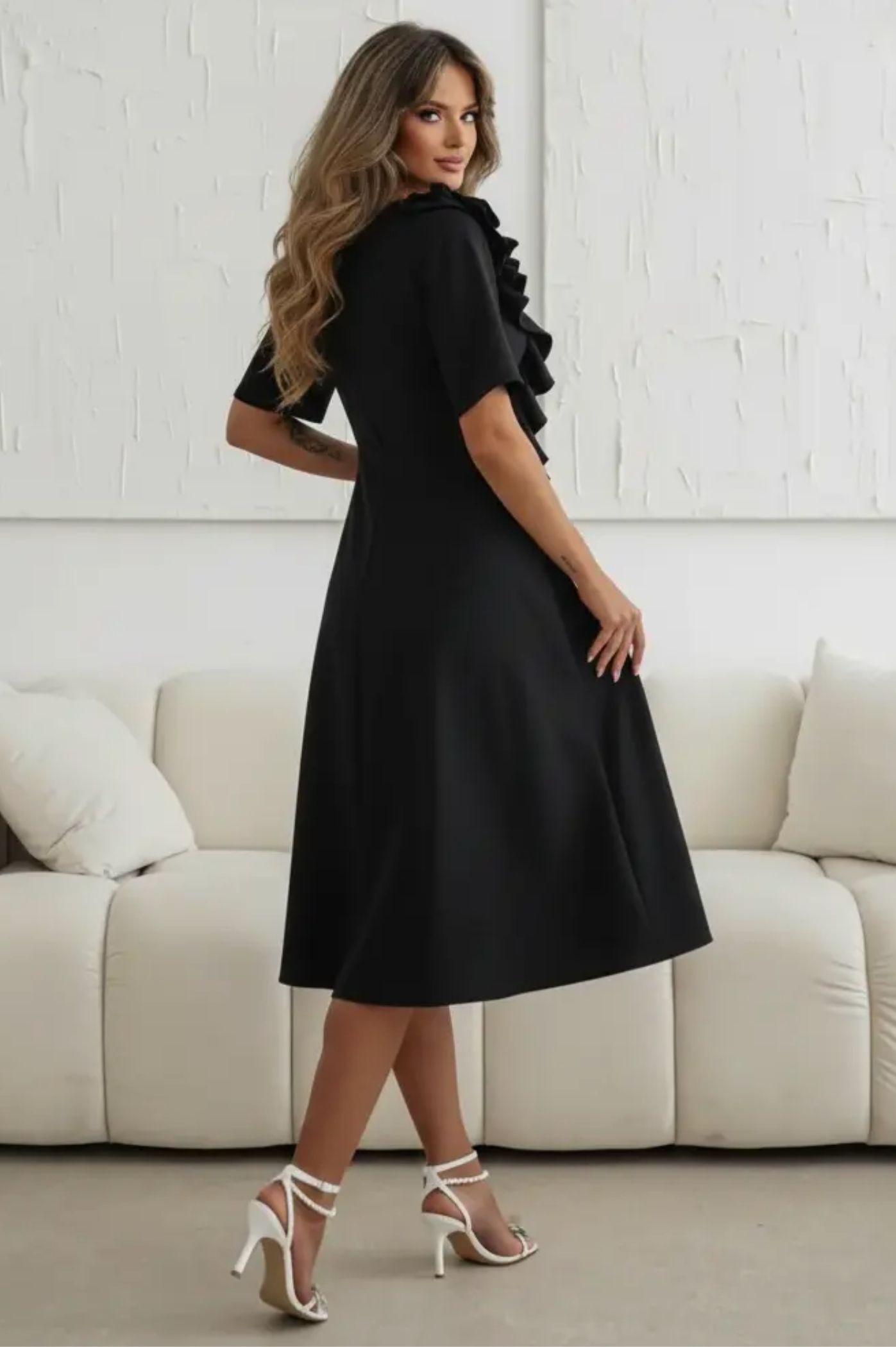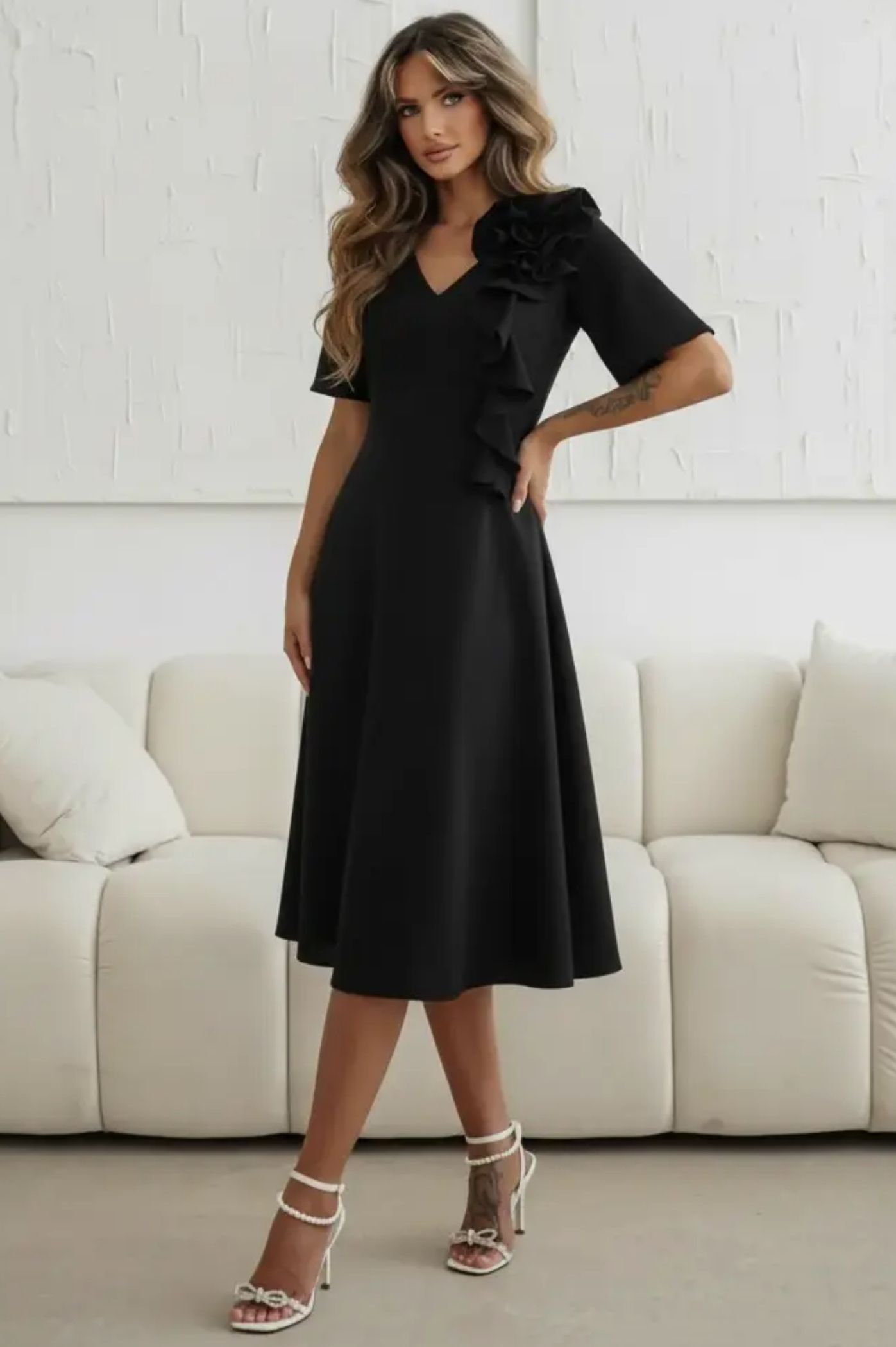 Αναδείξτε το στυλ σας με αυτό το υπέροχο μίντι φόρεμα, που συνδυάζει τη διαχρονική απλότητα με μια δόση υψηλής ραπτικής. Σχεδιασμένο σε άλφα γραμμή, προσφέρει την απόλυτη άνεση και κίνηση, καθιστώντας το την ιδανική επιλογή για καλεσμένη σε γάμο, βάπτιση ή οποιαδήποτε επίσημη κοινωνική εκδήλωση. Διαθέτει ένα εντυπωσιακό, τρισδιάστατο λουλούδι στον ώμο που καταλήγει σε κομψά βολάν, χαρίζοντας μοναδικό χαρακτήρα στο look σας. Η διακριτική λαιμόκοψη σε σχήμα V αναδεικνύει το μπούστο με έναν σοφιστικέ τρόπο. Τα άνετα κοντά μανίκια προσφέρουν κάλυψη, καθιστώντας το φόρεμα κατάλληλο για όλες τις εποχές.