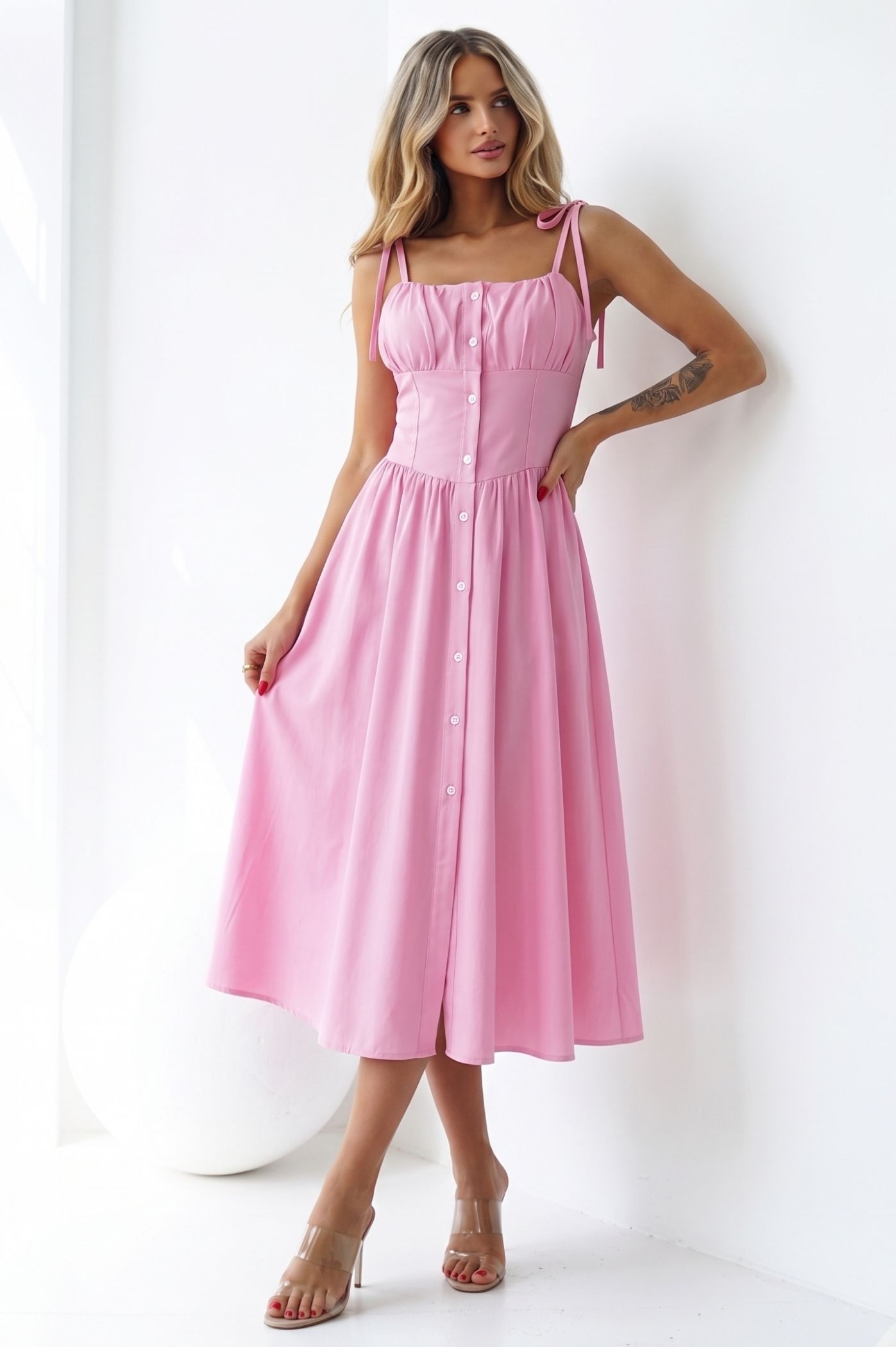 Ανακαλύψτε το απόλυτο "must-have" κομμάτι για τις ανοιξιάτικες και καλοκαιρινές σας εμφανίσεις. Αυτό το midi φόρεμα συνδυάζει τον ρομαντισμό με τη σύγχρονη αισθητική, προσφέροντας μια κομψή και θηλυκή σιλουέτα που θα λατρέψετε. Το μπούστο σε στυλ κορσέ αγκαλιάζει ομοιόμορφα το σώμα, προσδίδοντας μια διαχρονική θηλυκότητα και σταθερή εφαρμογή. Διαθέτει διακριτικά κουμπιά στο μπροστινό μέρος και κομψές τιράντες που δένουν στους ώμους, επιτρέποντάς σας να ρυθμίσετε το μήκος τους για την ιδανική εφαρμογή. Η φούστα με ελαφριά κίνηση προσφέρει άνεση και στυλ, καθιστώντας το φόρεμα κατάλληλο τόσο για πρωινές βόλτες όσο και για πιο επίσημες περιστάσεις.