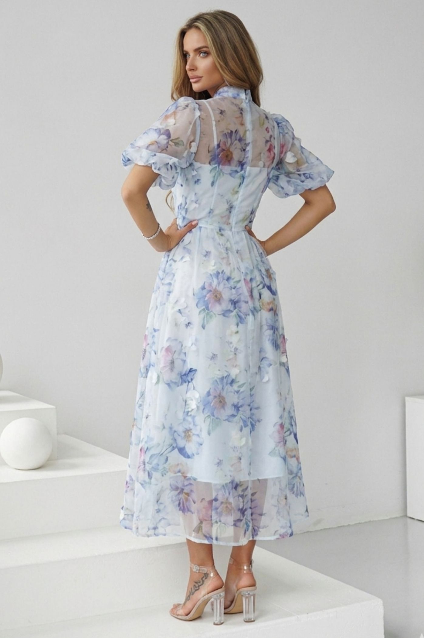 ΦΟΡΕΜΑ MIDI ΣΕΜΙΖΙΕ FLORAL ΜΕ BALLOON ΜΑΝΙΚΙΑ – ΜΠΛΕ