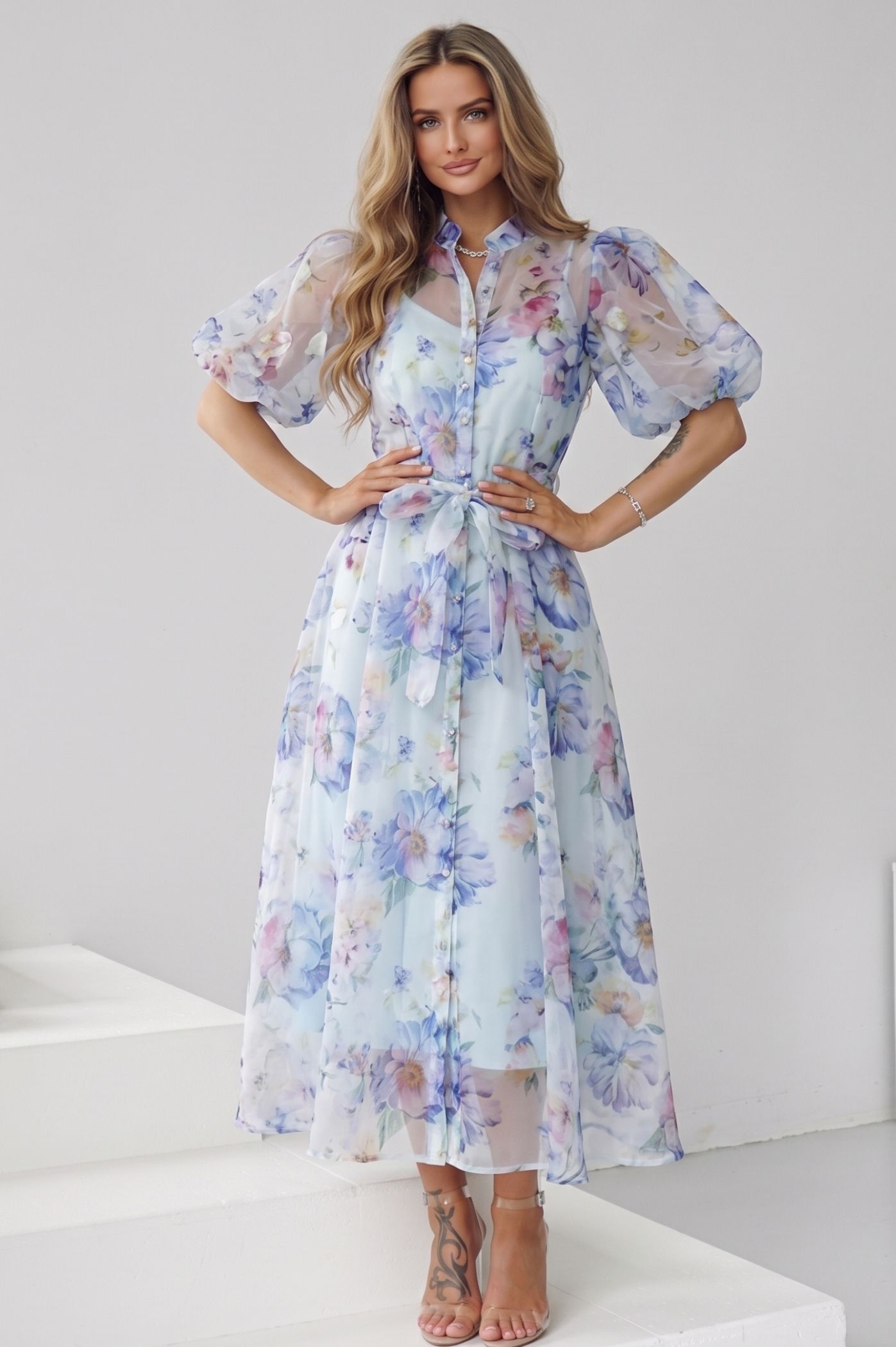 Ανακαλύψτε τη φινέτσα και τη ρομαντική διάθεση με αυτό το υπέροχο midi floral φόρεμα. Με μια πανδαισία λουλουδάτων μοτίβων σε απαλές αποχρώσεις, αποτελεί την ιδανική επιλογή για τις επίσημες καλοκαιρινές σας εμφανίσεις, συνδυάζοντας την κλασική αισθητική με τις σύγχρονες τάσεις της μόδας. Τα φουσκωτά μανίκια προσδίδουν όγκο και μια αίσθηση "high fashion", χαρίζοντας στο φόρεμα μια μοναδική, αριστοκρατική κίνηση. Η ενσωματωμένη ζώνη στη μέση αναδεικνύει τις καμπύλες σας με τον πιο κομψό τρόπο, προσφέροντας ισορροπία στη σιλουέτα. Το διαφώτο, αέρινο ύφασμα σε συνδυασμό με το κλείσιμο με κουμπιά, δημιουργεί ένα look που αποπνέει δροσιά και φρεσκάδα. Ιδανικό για γάμους, βαπτίσεις, cocktail πάρτι ή οποιαδήποτε εκδήλωση απαιτεί μια προσεγμένη και θηλυκή εμφάνιση.