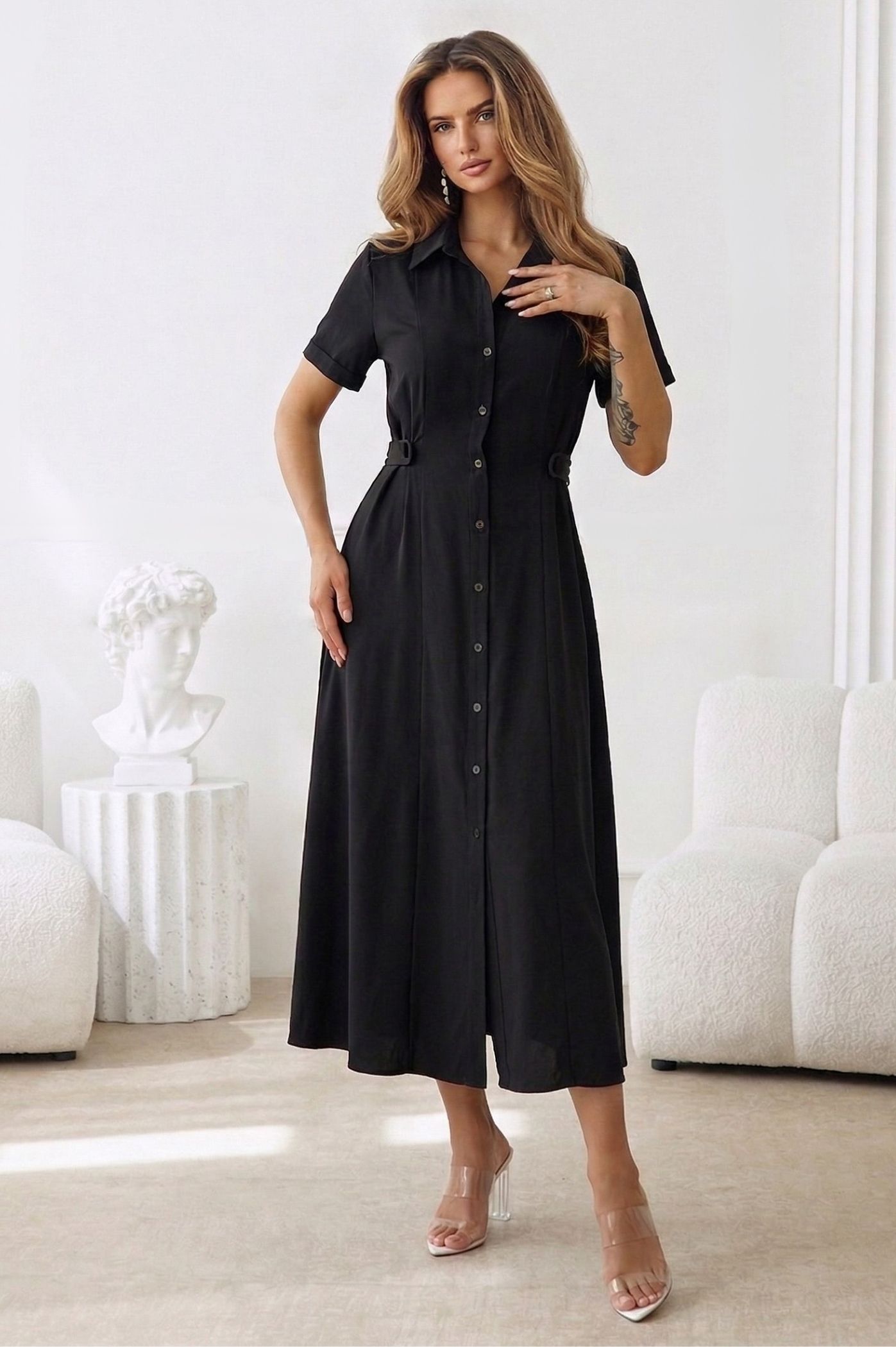 Ανακαλύψτε το απόλυτο midi φόρεμα της σεζόν! Αυτό το κομψό και αέρινο φόρεμα αποτελεί την ιδανική επιλογή για κάθε γυναίκα που αναζητά στυλ και άνεση. Το έξυπνο λάστιχο στη μέση τονίζει τη σιλουέτα σας προσφέροντας παράλληλα άνεση καθ' όλη τη διάρκεια της ημέρας. Διαθέτει κλασικό γιακά, κοντά μανίκια και λειτουργική σειρά από κουμπιά στο μπροστινό μέρος, προσδίδοντας έναν διαχρονικό chic χαρακτήρα. Ιδανικό για πρωινές εμφανίσεις στο γραφείο, χαλαρές βόλτες, αλλά και για πιο επίσημες περιστάσεις. Συνδυάστε το με τα αγαπημένα σας πέδιλα ή sneakers για ένα ολοκληρωμένο outfit.