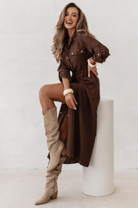 Αναδείξτε το safari chic στυλ με αυτό το midi σεμιζιέ Φόρεμα. Ένα versatile κομμάτι που συνδυάζει την άνεση με την κομψότητα, ιδανικό για καθημερινές εμφανίσεις, office wear και πρωινές βόλτες. Το φόρεμα έχει γραμμή πουκαμίσου, με κλασικό γιακά και κουμπιά κατά μήκος του μπροστινού μέρους. Διαθέτει διακοσμητικές τσέπες στο στήθος και πρακτικές πλαϊνές τσέπες. Το χαρακτηριστικό του γνώρισμα είναι η σούρα στη μέση, που επιτρέπει να ρυθμίσετε την εφαρμογή, τονίζοντας τη σιλουέτα σας. Το Midi μήκος με το σχίσιμο στο πόδι προσθέτει κίνηση και θηλυκότητα. Μπορεί να φορεθεί είτε ως φόρεμα είτε ως μακρύ jacket/παλτό ανοιχτό. Συνδυάστε το με μπότες για ένα look που ταιριάζει απόλυτα στο φθινόπωρο.