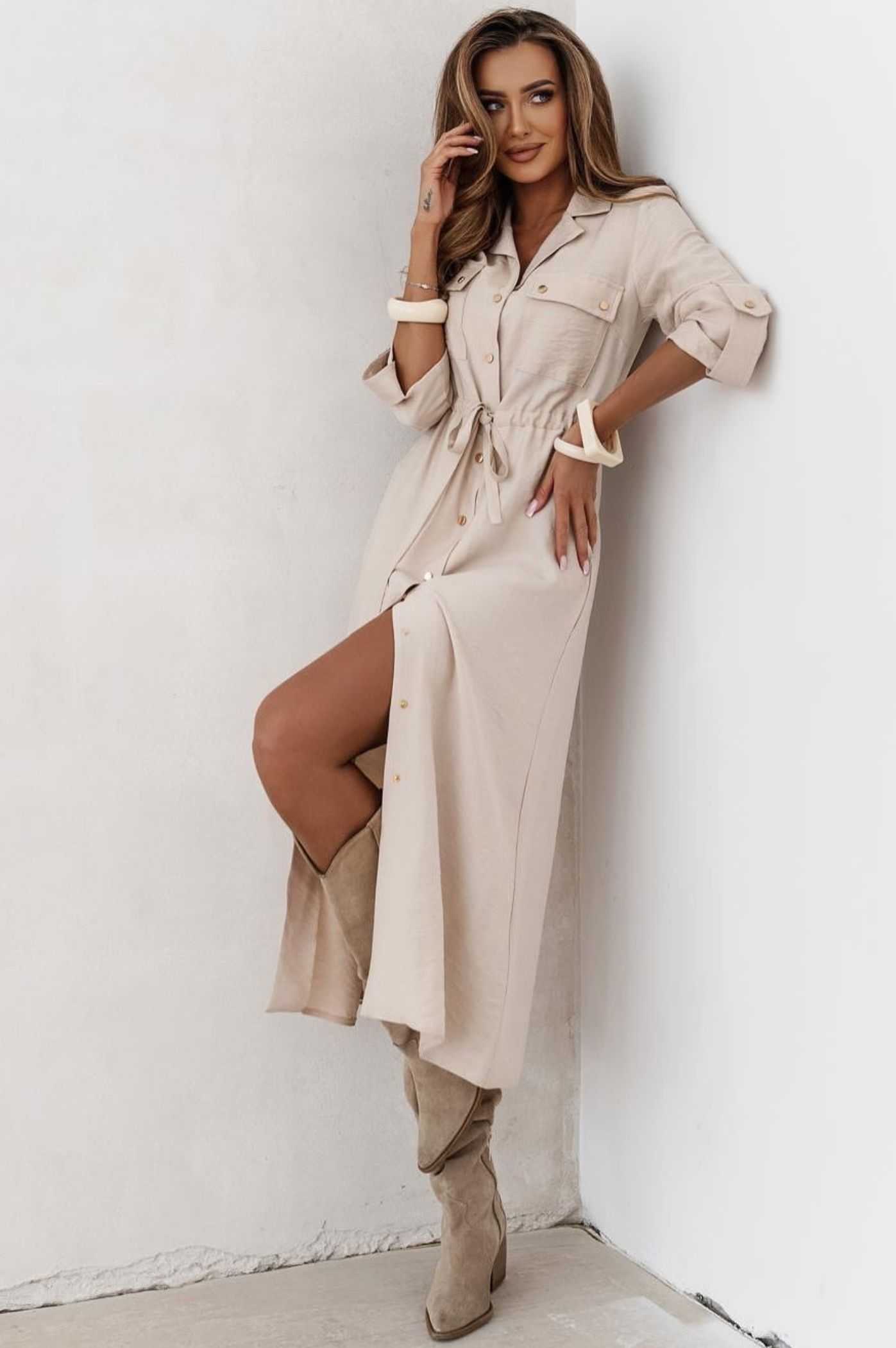 Αναδείξτε το safari chic στυλ με αυτό το midi σεμιζιέ Φόρεμα. Ένα versatile κομμάτι που συνδυάζει την άνεση με την κομψότητα, ιδανικό για καθημερινές εμφανίσεις, office wear και πρωινές βόλτες. Το φόρεμα έχει γραμμή πουκαμίσου, με κλασικό γιακά και κουμπιά κατά μήκος του μπροστινού μέρους. Διαθέτει διακοσμητικές τσέπες στο στήθος και πρακτικές πλαϊνές τσέπες. Το χαρακτηριστικό του γνώρισμα είναι η σούρα στη μέση, που επιτρέπει να ρυθμίσετε την εφαρμογή, τονίζοντας τη σιλουέτα σας. Το Midi μήκος με το σχίσιμο στο πόδι προσθέτει κίνηση και θηλυκότητα. Μπορεί να φορεθεί είτε ως φόρεμα είτε ως μακρύ jacket/παλτό ανοιχτό. Συνδυάστε το με μπότες για ένα look που ταιριάζει απόλυτα στο φθινόπωρο.