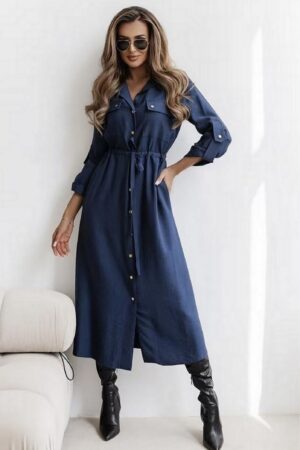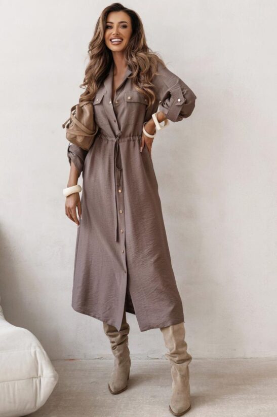 Αναδείξτε το safari chic στυλ με αυτό το midi σεμιζιέ Φόρεμα. Ένα versatile κομμάτι που συνδυάζει την άνεση με την κομψότητα, ιδανικό για καθημερινές εμφανίσεις, office wear και πρωινές βόλτες. Το φόρεμα έχει γραμμή πουκαμίσου, με κλασικό γιακά και κουμπιά κατά μήκος του μπροστινού μέρους. Διαθέτει διακοσμητικές τσέπες στο στήθος και πρακτικές πλαϊνές τσέπες. Το χαρακτηριστικό του γνώρισμα είναι η σούρα στη μέση, που επιτρέπει να ρυθμίσετε την εφαρμογή, τονίζοντας τη σιλουέτα σας. Το Midi μήκος με το σχίσιμο στο πόδι προσθέτει κίνηση και θηλυκότητα. Μπορεί να φορεθεί είτε ως φόρεμα είτε ως μακρύ jacket/παλτό ανοιχτό. Συνδυάστε το με μπότες για ένα look που ταιριάζει απόλυτα στο φθινόπωρο.