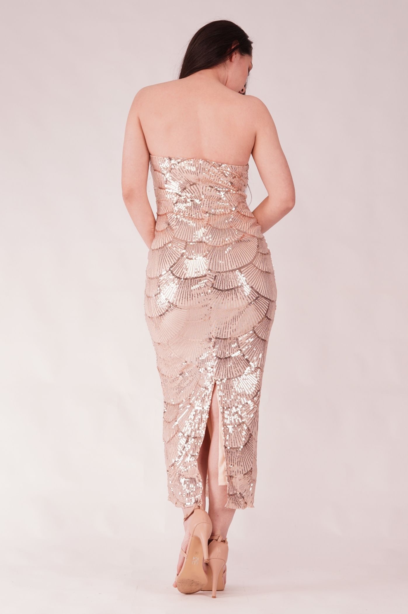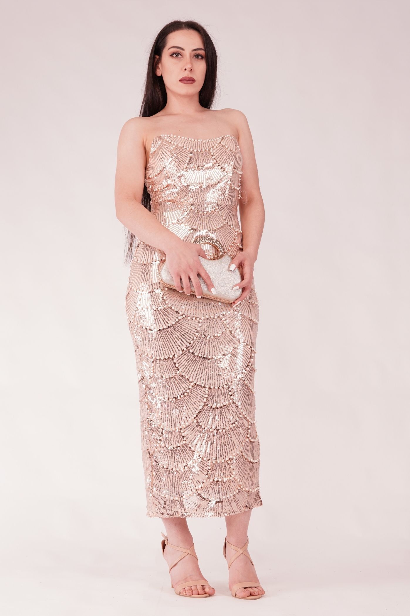 Αναδείξτε το στυλ σας με αυτό το midi στράπλες φόρεμα είναι η επιτομή της vintage φινέτσας. Το φόρεμα διαθέτει μια εντυπωσιακή γεωμετρική υφή που δημιουργείται από σειρές από μικρές παγιέτες και πέρλες. Αυτό το περίτεχνο κέντημα παραπέμπει στο στυλ Art Deco ή σε μια αίσθηση κοχυλιού, προσφέροντας λάμψη και τρισδιάστατη όψη. Η στράπλες γραμμή αναδεικνύει τους ώμους και το ντεκολτέ, ενώ το midi μήκος προσφέρει την τέλεια ισορροπία μεταξύ επίσημης εμφάνισης και μοντέρνου στυλ. Η εφαρμογή είναι στενή και κολακεύει τη σιλουέτα. Είναι ιδανικό για γάμους, βαφτίσεις, cocktail parties ή γιορτινά δείπνα.
