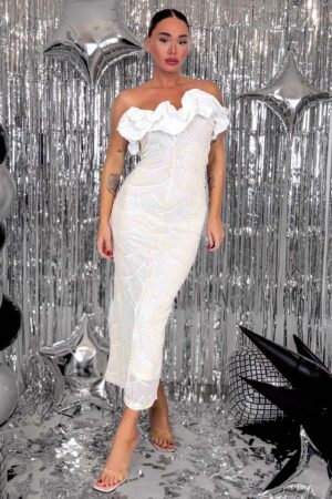 Αναδείξτε ένα look υψηλής κομψότητας με αυτό το εκθαμβωτικό μίντι φόρεμα. Το φόρεμα είναι καλυμμένο με αστραφτερές παγιέτες σε ένα εντυπωσιακό μοτίβο βεντάλιας που προσδίδει κίνηση και λάμψη. Η γραμμή αγκαλιάζει το σώμα, τονίζοντας τη σιλουέτα. Το επάνω μέρος διαθέτει στράπλες σχεδιασμό και ένα μεγάλο, εντυπωσιακό βολάν από σατέν ύφασμα, προσθέτοντας δραματικότητα και φινέτσα. Ιδανικό για επίσημες δεξιώσεις, ρεβεγιόν, κοκτέιλ πάρτι ή οποιαδήποτε βραδινή εκδήλωση όπου θέλετε να ξεχωρίσετε. Μπορεί να φορεθεί με πέδιλα ή γόβες και minimal αξεσουάρ.