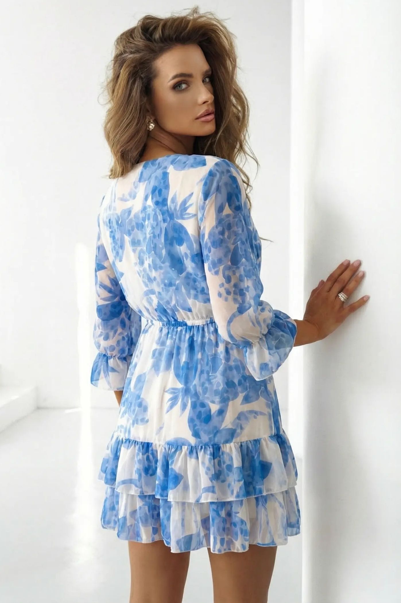 Πρόσθεσε μια πινελιά ρομαντισμού και φρεσκάδας στις εμφανίσεις σου με το floral μίνι φόρεμα. Αυτό το φόρεμα είναι η απόλυτη επιλογή για chic ανοιξιάτικες και καλοκαιρινές εμφανίσεις, από ένα πρωινό brunch μέχρι μια επίσημη κοινωνική εκδήλωση. Εντυπωσιακό μοτίβο με λουλούδια που εκπέμπει φινέτσα και αέρινη διάθεση. Κολακευτικό κρουαζέ ντεκολτέ σε σχήμα V που αναδεικνύει το μπούστο με έναν κομψό τρόπο. Το κάτω μέρος του φορέματος αποτελείται από διαδοχικά βολάν, δίνοντας κίνηση, όγκο και μια παιχνιδιάρικη αίσθηση σε κάθε σου βήμα. Μακριά, ελαφρώς διάφανα μανίκια που καταλήγουν σε βολάν στις μανσέτες, προσφέροντας μια ρομαντική και αιθέρια σιλουέτα. Διαθέτει λάστιχο στη μέση που τονίζει τη σιλουέτα, εξασφαλίζοντας τέλεια εφαρμογή και άνεση όλη μέρα.
