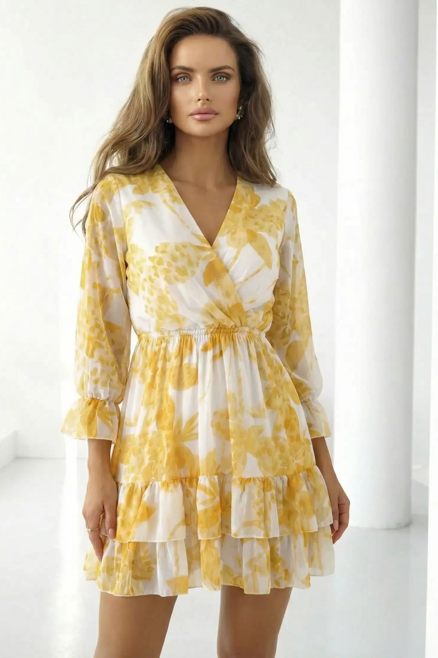 Πρόσθεσε μια πινελιά ρομαντισμού και φρεσκάδας στις εμφανίσεις σου με το floral μίνι φόρεμα. Αυτό το φόρεμα είναι η απόλυτη επιλογή για chic ανοιξιάτικες και καλοκαιρινές εμφανίσεις, από ένα πρωινό brunch μέχρι μια επίσημη κοινωνική εκδήλωση. Εντυπωσιακό μοτίβο με λουλούδια που εκπέμπει φινέτσα και αέρινη διάθεση. Κολακευτικό κρουαζέ ντεκολτέ σε σχήμα V που αναδεικνύει το μπούστο με έναν κομψό τρόπο. Το κάτω μέρος του φορέματος αποτελείται από διαδοχικά βολάν, δίνοντας κίνηση, όγκο και μια παιχνιδιάρικη αίσθηση σε κάθε σου βήμα. Μακριά, ελαφρώς διάφανα μανίκια που καταλήγουν σε βολάν στις μανσέτες, προσφέροντας μια ρομαντική και αιθέρια σιλουέτα. Διαθέτει λάστιχο στη μέση που τονίζει τη σιλουέτα, εξασφαλίζοντας τέλεια εφαρμογή και άνεση όλη μέρα.