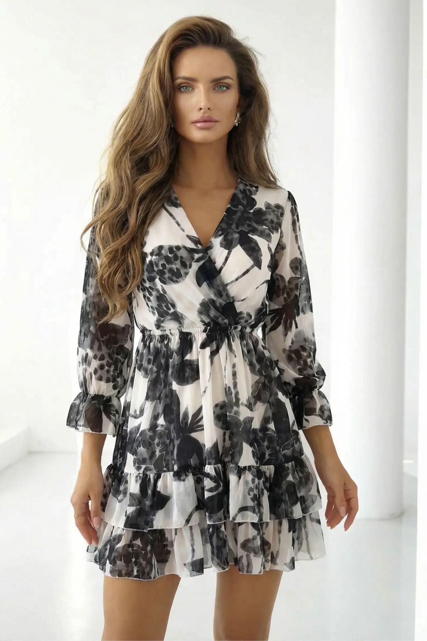 Πρόσθεσε μια πινελιά ρομαντισμού και φρεσκάδας στις εμφανίσεις σου με το floral μίνι φόρεμα. Αυτό το φόρεμα είναι η απόλυτη επιλογή για chic ανοιξιάτικες και καλοκαιρινές εμφανίσεις, από ένα πρωινό brunch μέχρι μια επίσημη κοινωνική εκδήλωση. Εντυπωσιακό μοτίβο με λουλούδια που εκπέμπει φινέτσα και αέρινη διάθεση. Κολακευτικό κρουαζέ ντεκολτέ σε σχήμα V που αναδεικνύει το μπούστο με έναν κομψό τρόπο. Το κάτω μέρος του φορέματος αποτελείται από διαδοχικά βολάν, δίνοντας κίνηση, όγκο και μια παιχνιδιάρικη αίσθηση σε κάθε σου βήμα. Μακριά, ελαφρώς διάφανα μανίκια που καταλήγουν σε βολάν στις μανσέτες, προσφέροντας μια ρομαντική και αιθέρια σιλουέτα. Διαθέτει λάστιχο στη μέση που τονίζει τη σιλουέτα, εξασφαλίζοντας τέλεια εφαρμογή και άνεση όλη μέρα.
