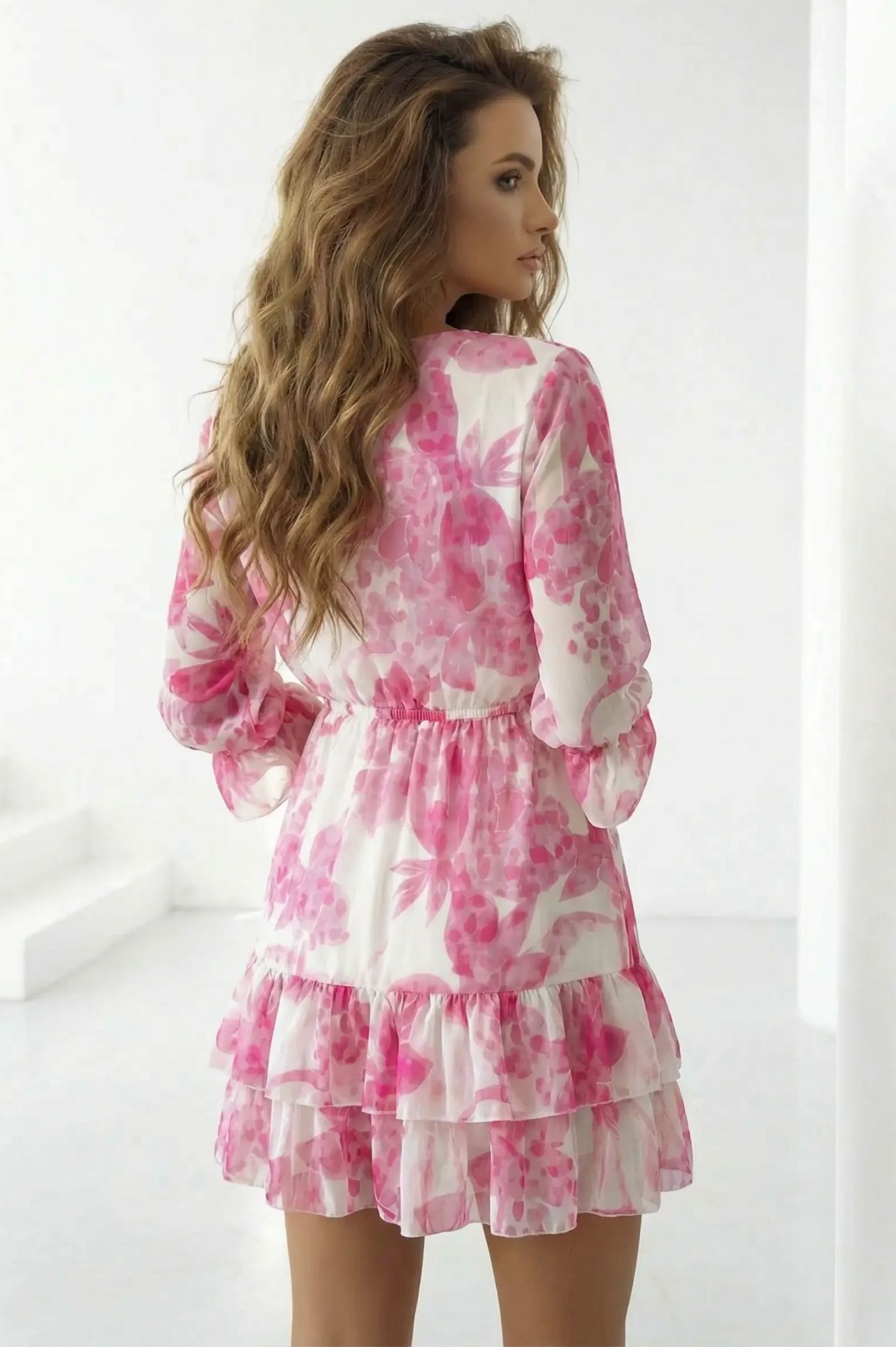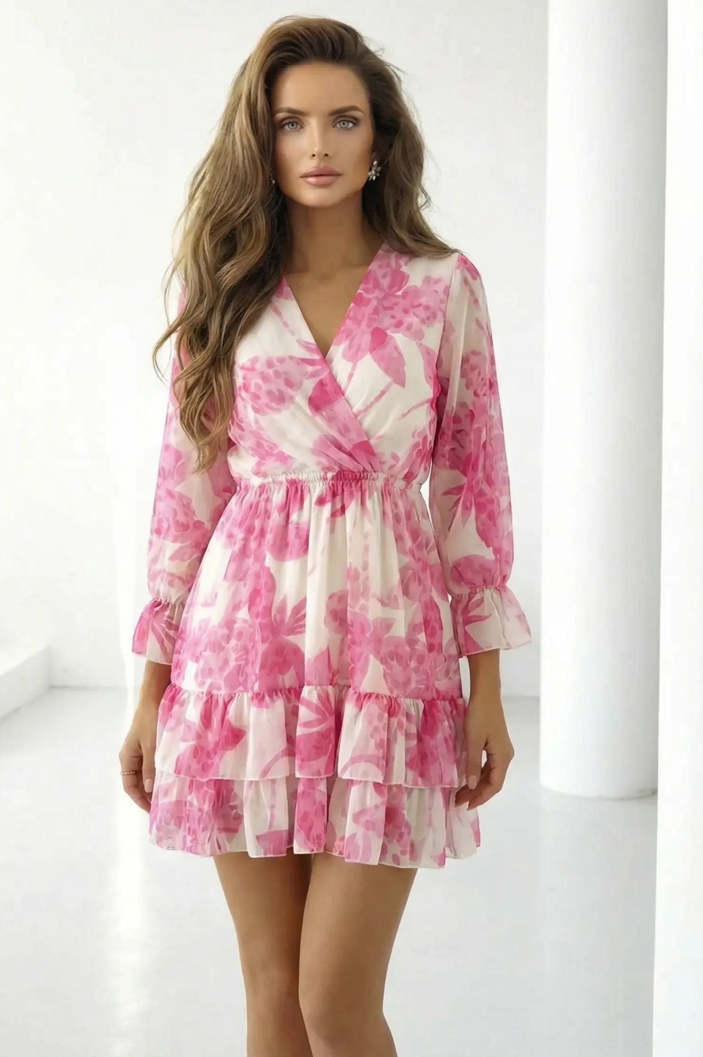 Πρόσθεσε μια πινελιά ρομαντισμού και φρεσκάδας στις εμφανίσεις σου με το floral μίνι φόρεμα. Αυτό το φόρεμα είναι η απόλυτη επιλογή για chic ανοιξιάτικες και καλοκαιρινές εμφανίσεις, από ένα πρωινό brunch μέχρι μια επίσημη κοινωνική εκδήλωση. Εντυπωσιακό μοτίβο με λουλούδια που εκπέμπει φινέτσα και αέρινη διάθεση. Κολακευτικό κρουαζέ ντεκολτέ σε σχήμα V που αναδεικνύει το μπούστο με έναν κομψό τρόπο. Το κάτω μέρος του φορέματος αποτελείται από διαδοχικά βολάν, δίνοντας κίνηση, όγκο και μια παιχνιδιάρικη αίσθηση σε κάθε σου βήμα. Μακριά, ελαφρώς διάφανα μανίκια που καταλήγουν σε βολάν στις μανσέτες, προσφέροντας μια ρομαντική και αιθέρια σιλουέτα. Διαθέτει λάστιχο στη μέση που τονίζει τη σιλουέτα, εξασφαλίζοντας τέλεια εφαρμογή και άνεση όλη μέρα.