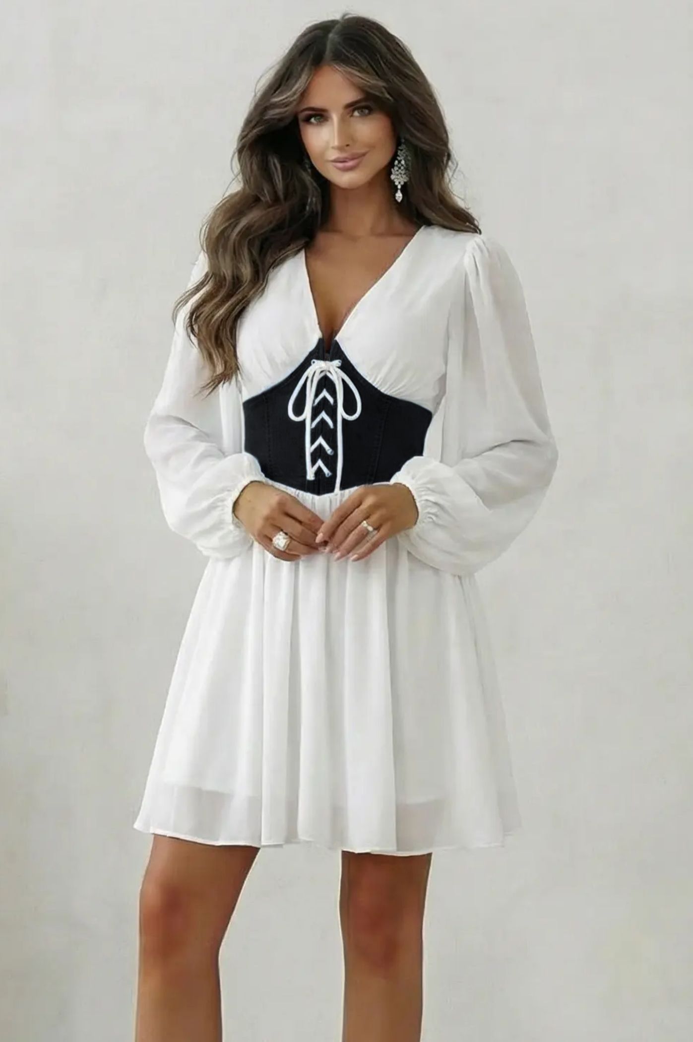Κάνε τη διαφορά με το πιο ανατρεπτικό mini dress της σεζόν. Το φόρεμα αυτό συνδυάζει την αθωότητα του λευκού αέρινου υφάσματος με το δυναμισμό του denim, δημιουργώντας ένα look που ισορροπεί ανάμεσα στο boho-chic και το σύγχρονο streetwear. Διαθέτει ενσωματωμένο τζιν κορσέ στη μέση με κορδόνια που σφίγγουν (lace-up), σμιλεύοντας τη σιλουέτα και προσφέροντας άψογη εφαρμογή. Μακριά, ελαφρώς διάφανα μανίκια με λάστιχο στους καρπούς που προσθέτουν μια ρομαντική και αιθέρια νότα. Κολακευτική λαιμόκοψη σε σχήμα V που αναδεικνύει το μπούστο με κομψότητα. Ιδανικό για να αναδείξεις τα πόδια σου, με ανάλαφρη κίνηση στο κάτω μέρος.