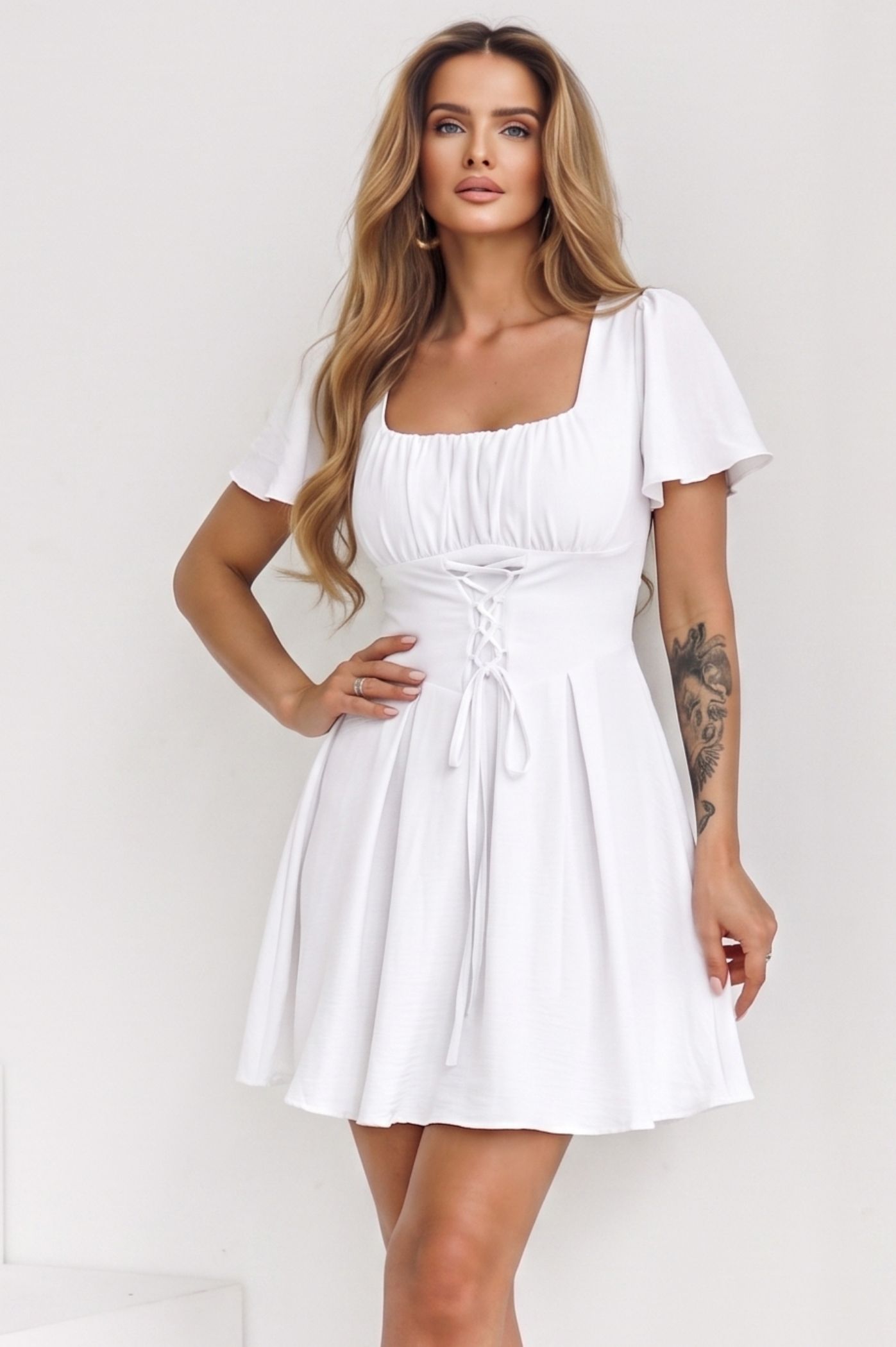 Ανακαλύψτε τη θηλυκότητα σε κάθε της λεπτομέρεια με αυτό το εντυπωσιακό mini φόρεμα. Με έμπνευση από το vintage στυλ του κορσέ, το φόρεμα αυτό συνδυάζει την παιχνιδιάρικη άλφα γραμμή με μια σοφιστικέ πινελιά, αποτελώντας την ιδανική επιλογή για τις πιο chic εμφανίσεις σας. Η λεπτομέρεια με τα κορδόνια στο μπροστινό μέρος (corset style) αγκαλιάζει και αναδεικνύει τη μέση, προσδίδοντας μια ιδιαίτερη και κολακευτική σιλουέτα. Η φούστα σε άλφα γραμμή χαρίζει κίνηση και άνεση, προσφέροντας ένα νεανικό και θηλυκό αποτέλεσμα. Τα κοντά μανίκια με ελαφρύ όγκο ολοκληρώνουν το ρομαντικό ύφος του φορέματος.