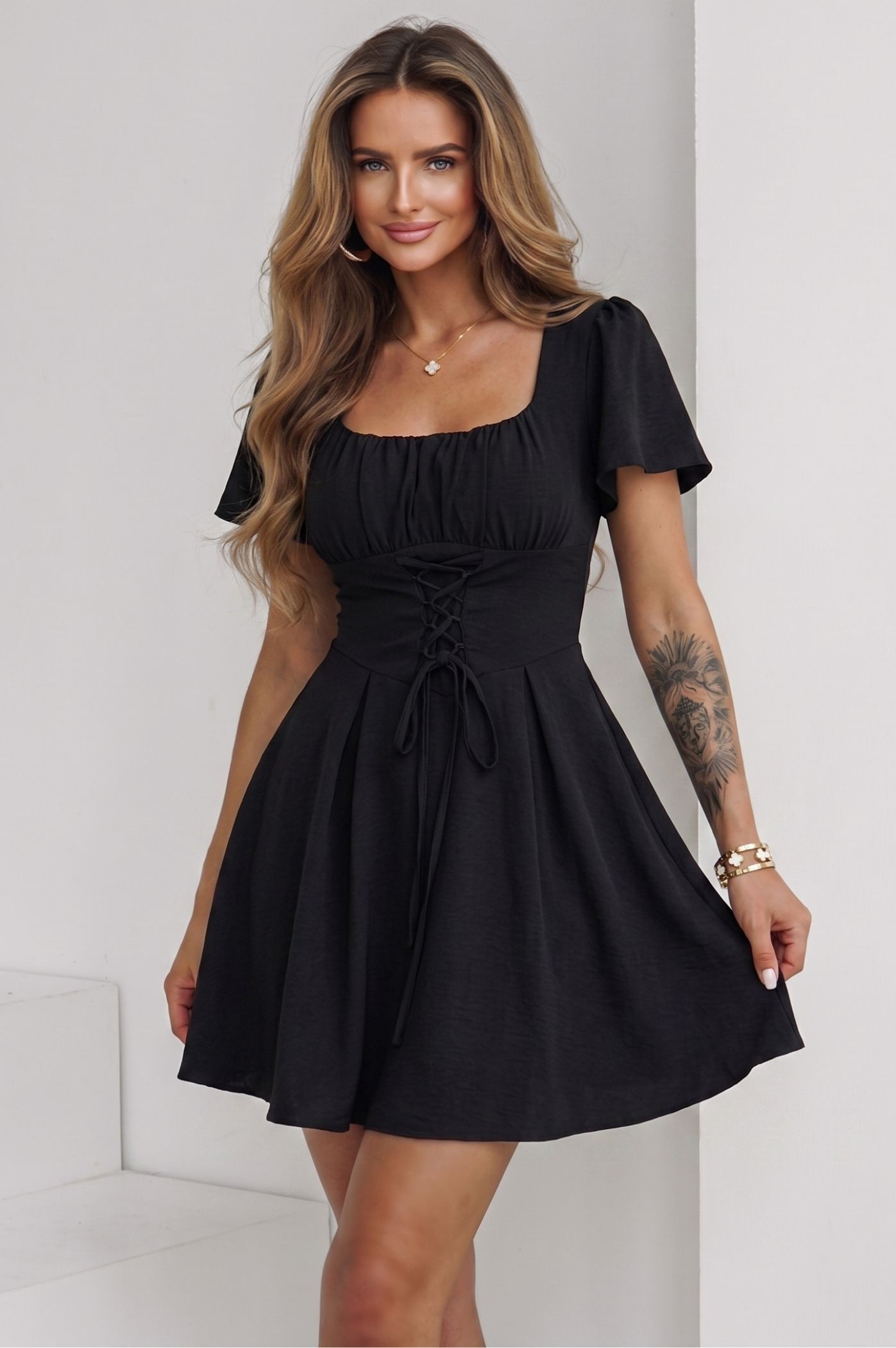 Ανακαλύψτε τη θηλυκότητα σε κάθε της λεπτομέρεια με αυτό το εντυπωσιακό mini φόρεμα. Με έμπνευση από το vintage στυλ του κορσέ, το φόρεμα αυτό συνδυάζει την παιχνιδιάρικη άλφα γραμμή με μια σοφιστικέ πινελιά, αποτελώντας την ιδανική επιλογή για τις πιο chic εμφανίσεις σας. Η λεπτομέρεια με τα κορδόνια στο μπροστινό μέρος (corset style) αγκαλιάζει και αναδεικνύει τη μέση, προσδίδοντας μια ιδιαίτερη και κολακευτική σιλουέτα. Η φούστα σε άλφα γραμμή χαρίζει κίνηση και άνεση, προσφέροντας ένα νεανικό και θηλυκό αποτέλεσμα. Τα κοντά μανίκια με ελαφρύ όγκο ολοκληρώνουν το ρομαντικό ύφος του φορέματος.