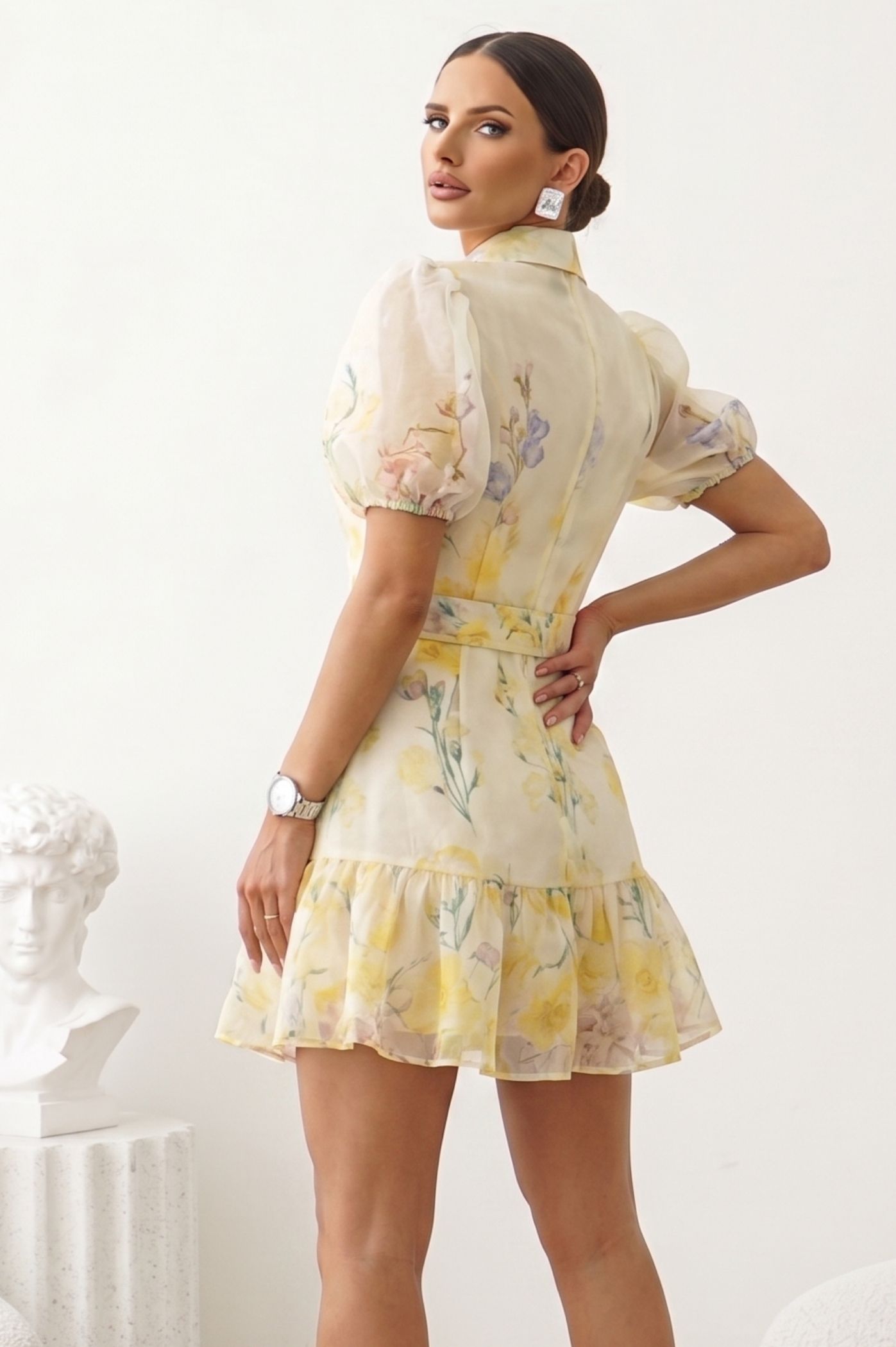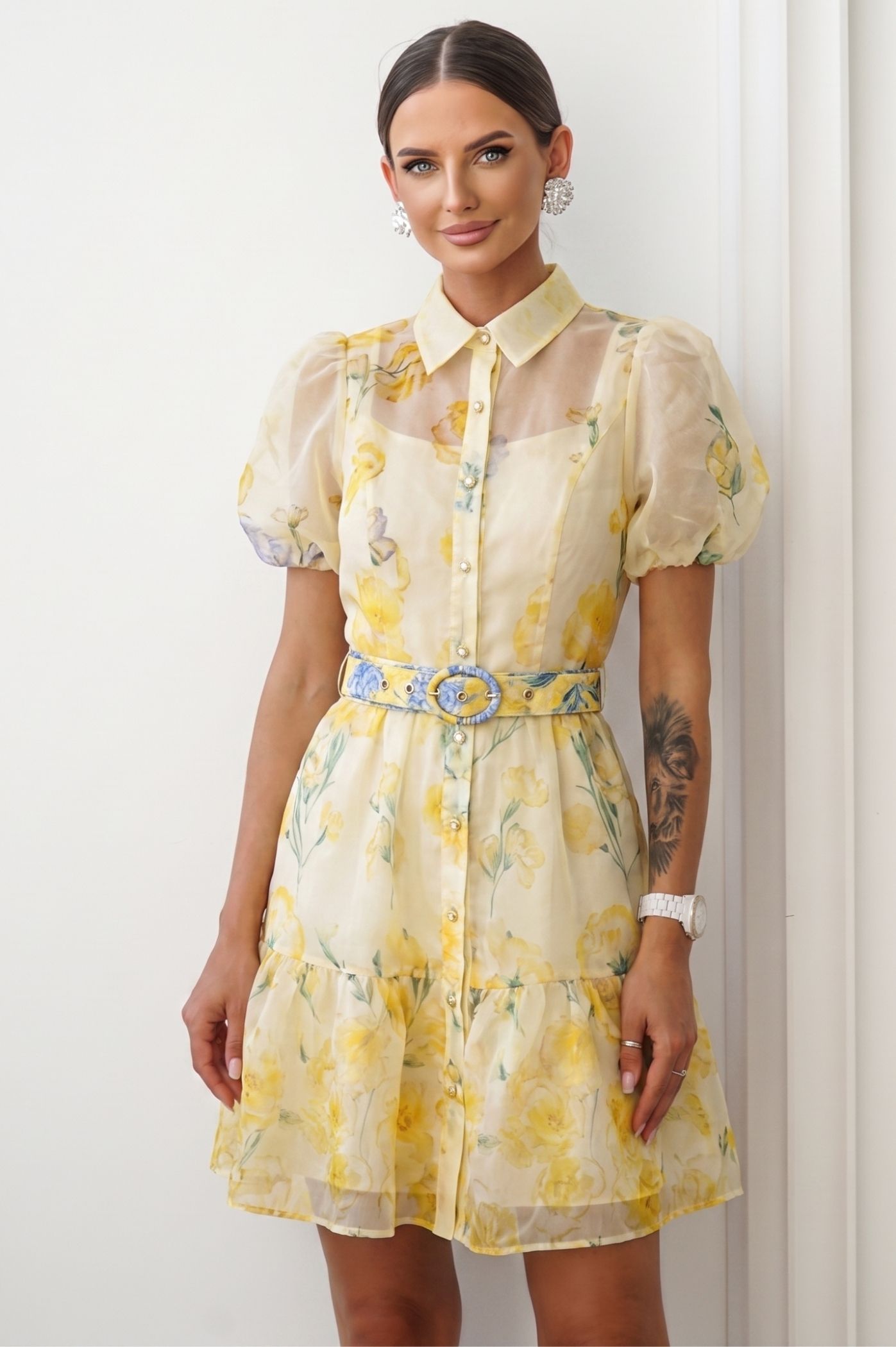 Αναδείξτε το στυλ σας με αυτό το υπέροχο mini φόρεμα, που αποπνέει φινέτσα και θηλυκότητα. Ο συνδυασμός του κλασικού πουκαμίσου με τις μοντέρνες λεπτομέρειες το καθιστά την απόλυτη επιλογή για τις πιο κομψές εμφανίσεις σας. Τα εντυπωσιακά φουσκωτά (balloon) μανίκια προσθέτουν όγκο και μια αέρινη, μοντέρνα διάθεση στο σύνολό σας. Το ντελικάτο floral print σε παστέλ τόνους δημιουργεί ένα ρομαντικό και άκρως ανοιξιάτικο αποτέλεσμα. Διαθέτει ασορτί ζώνη στη μέση με αγκράφα, η οποία τονίζει τη σιλουέτα σας, προσφέροντας απόλυτη ισορροπία μεταξύ της άνεσης και της θηλυκότητας. Το κλασικό γιακά και το μπροστινό κλείσιμο με κουμπιά προσδίδουν μια διαχρονική πινελιά σε αυτό το statement κομμάτι.