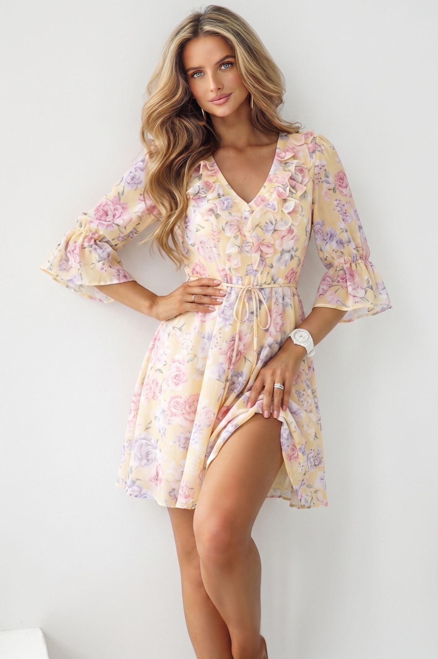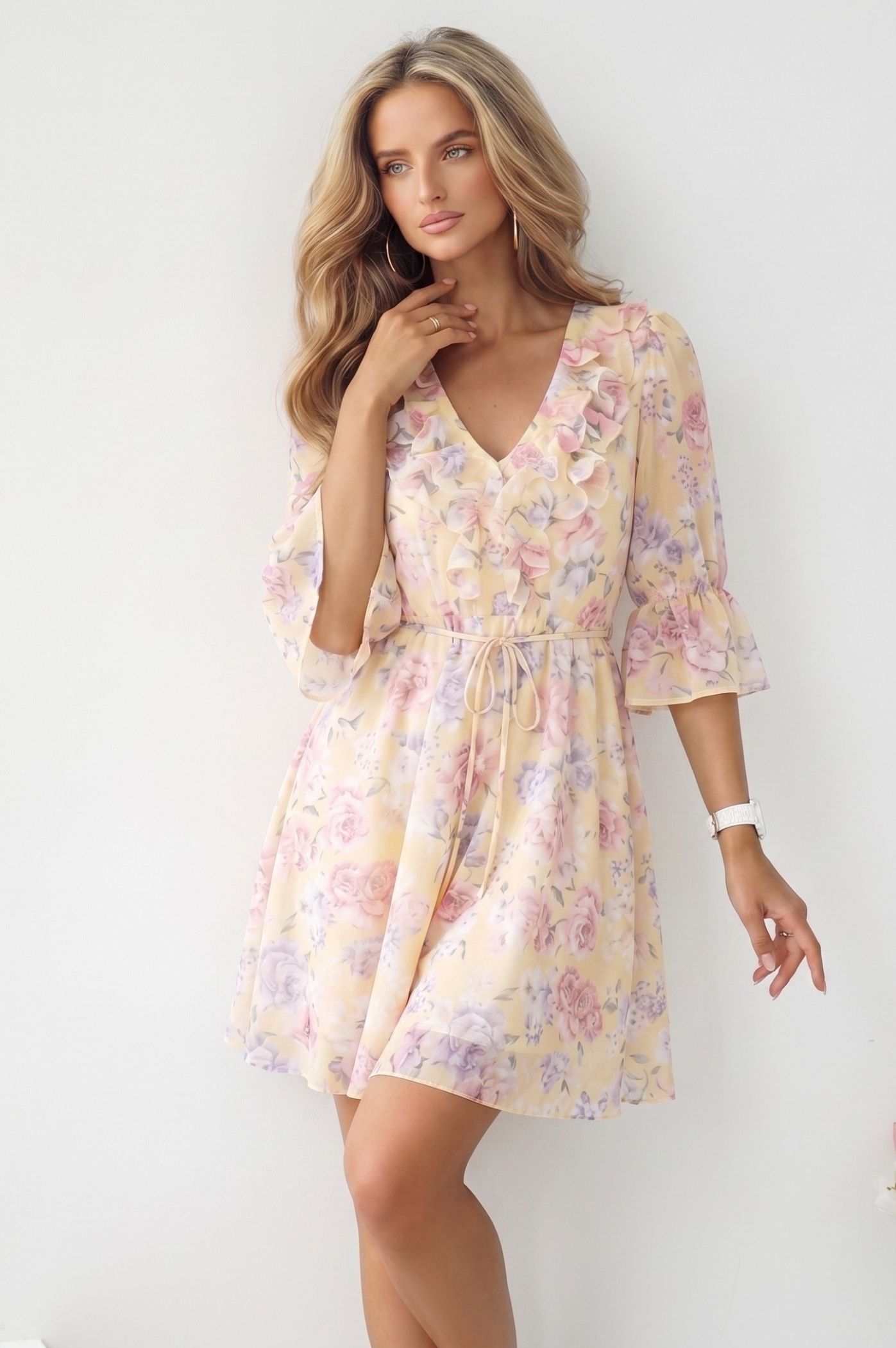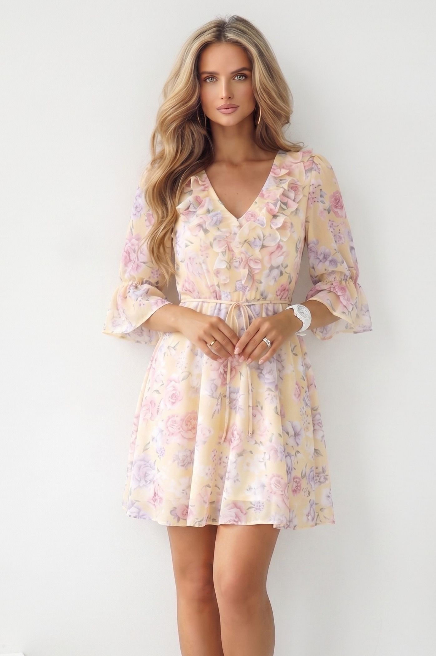 Αναδείξτε την γκαρνταρόμπα σας με αυτό το εκλεπτυσμένο mini floral φόρεμα, που συνδυάζει την ανοιξιάτικη φρεσκάδα με τη θηλυκή κομψότητα. Ένα κομμάτι ιδανικό για κάθε ειδική περίσταση, που θα σας χαρίσει μια αέρινη και στυλάτη εμφάνιση. Το εντυπωσιακό μοτίβο με τριαντάφυλλα σε παστέλ ροζ και λιλά αποχρώσεις πάνω σε λευκή βάση, προσδίδει μια ρομαντική και φρέσκια όψη, ιδανική για γάμους, βαπτίσεις ή garden parties. Το βαθύ V ντεκολτέ πλαισιώνεται από πλούσια βολάν που προσθέτουν όγκο και χάρη, αναδεικνύοντας το πάνω μέρος του σώματος με τον πιο θηλυκό τρόπο. Τα 3/4 μανίκια διαθέτουν κομψές λεπτομέρειες με δέσιμο (tie-detail) στους καρπούς, προσφέροντας μια μοντέρνα και παιχνιδιάρικη διάθεση στο συνολικό design. Διαθέτει λεπτή ζώνη που δένει στη μέση, επιτρέποντάς σας να προσαρμόσετε την εφαρμογή και να τονίσετε τη σιλουέτα σας με απόλυτη άνεση.